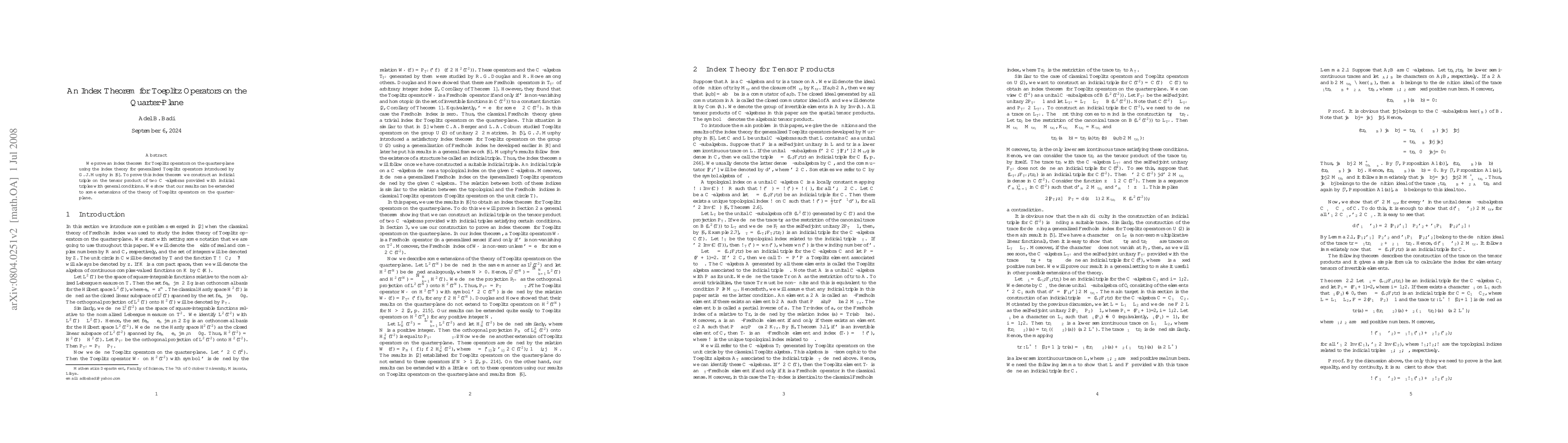 This paper proves an index theorem for Toeplitz operators on the quarter-plane, utilizing G. J. Murphy's generalized Toeplitz operator index theory. The authors construct an indicial triple on the tensor product of two C*-algebras to achieve this result, extending their findings to some operator theory extensions.