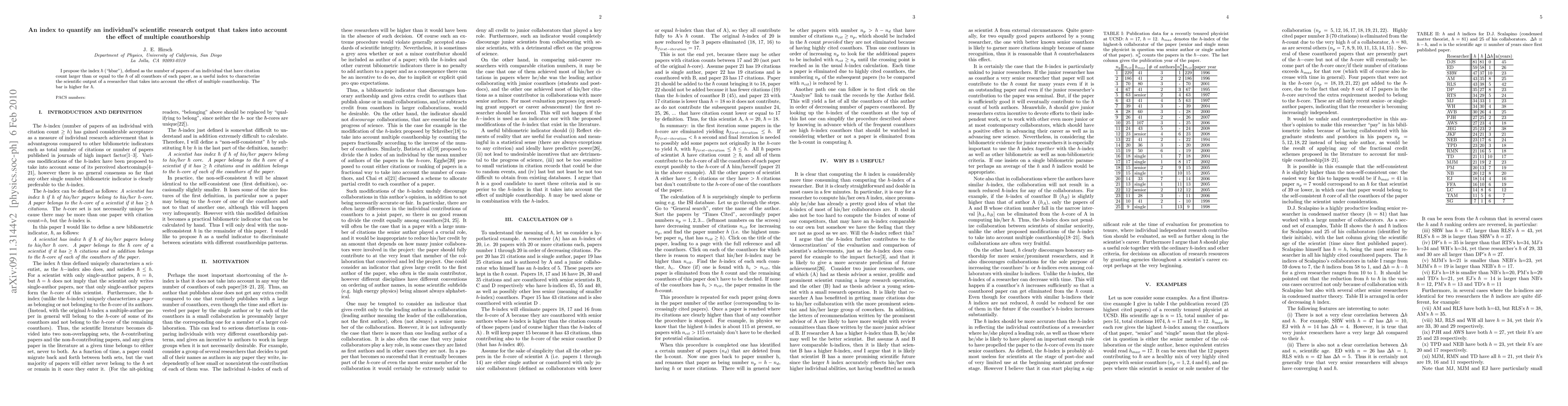 Summary: The paper introduces the $\hbar$ index to quantify an individual's scientific research output, considering the citation count relative to all coauthors' contributions, thereby addressing the complexities of multiple authorship. This index aims to provide a more nuanced measure of a researcher's impact.