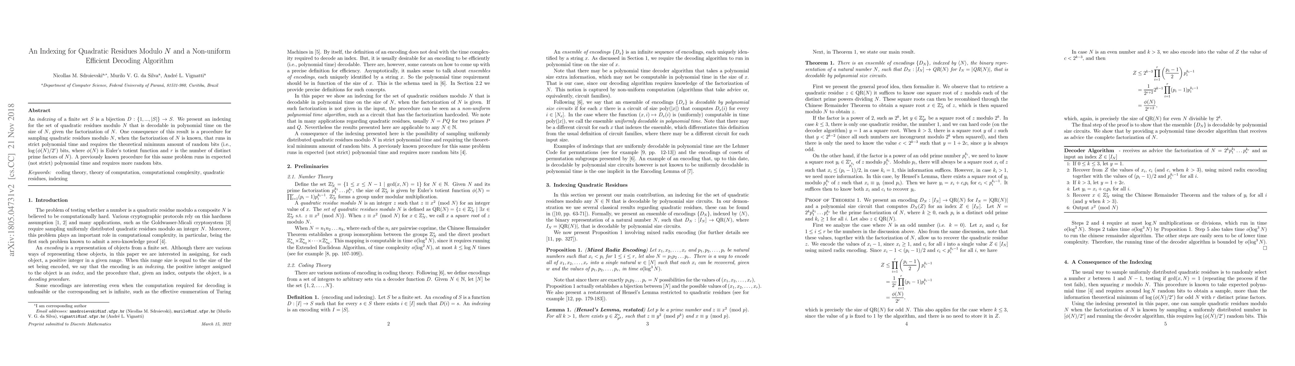 An \emph{indexing} of a finite set $S$ is a bijection $D : \{1,...,|S|\} \rightarrow S$. We present an indexing for the set of quadratic residues modulo $N$ that is decodable in polynomial time on the size of $N$, given the factorization of $N$. One consequence of this result is a procedure for sampling quadratic residues modulo $N$, when the factorization of $N$ is known, that runs in strict polynomial time and requires the theoretical minimum amount of random bits (i.e., $\log{(\phi(N)/2^r)}$ bits, where $\phi(N)$ is Euler's totient function and $r$ is the number of distinct prime factors of $N$). A previously known procedure for this same problem runs in expected (not strict) polynomial time and requires more random bits.