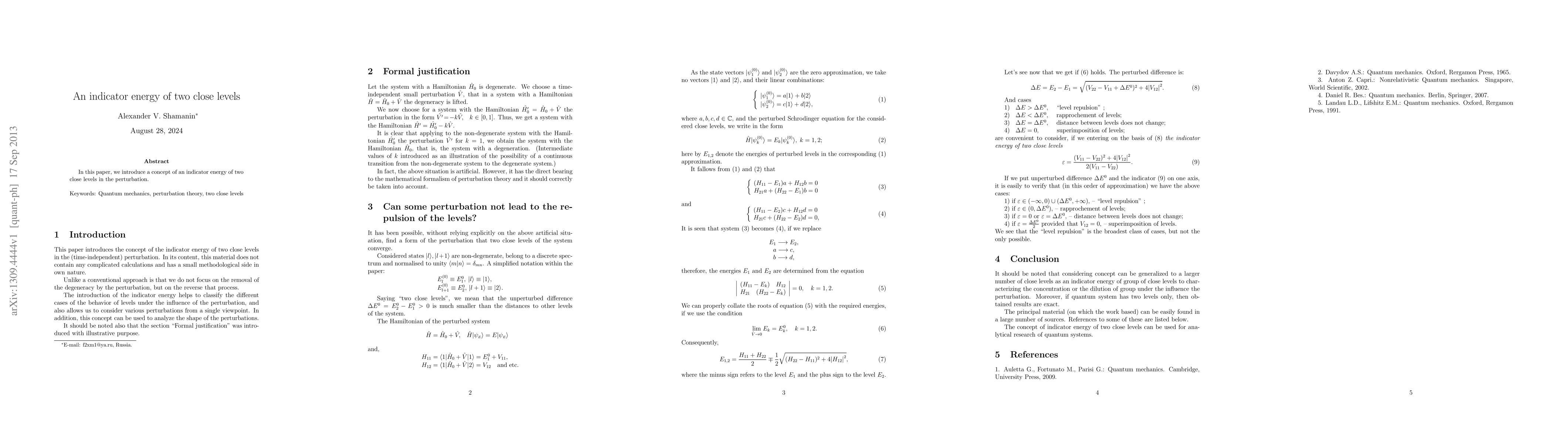 In this paper, we introduce a concept of an indicator energy of two close levels in the perturbation.