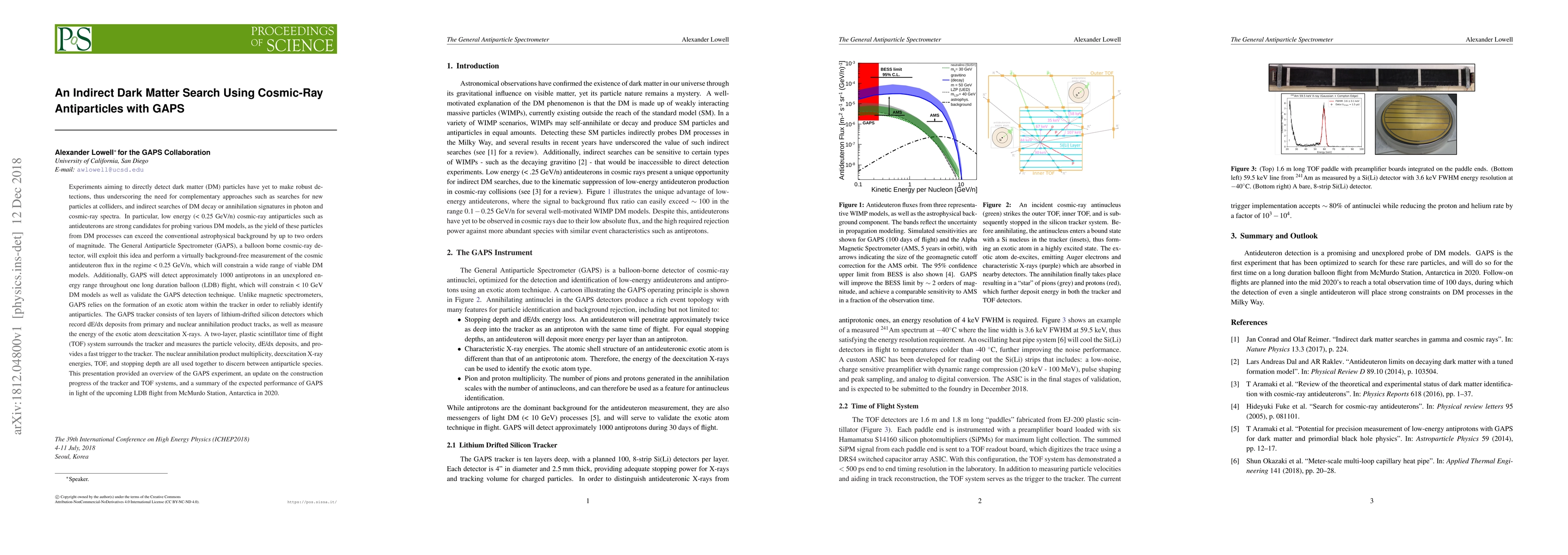 Experiments aiming to directly detect dark matter (DM) particles have yet to make robust detections, thus underscoring the need for complementary approaches such as searches for new particles at colliders, and indirect DM searches in cosmic-ray spectra. Low energy (< 0.25 GeV/n) cosmic-ray antiparticles such as antideuterons are strong candidates for probing DM models, as the yield of these particles from DM processes can exceed the astrophysical background by more than two orders of magnitude. The General Antiparticle Spectrometer (GAPS), a balloon borne cosmic-ray detector, will perform an ultra-low background measurement of the cosmic antideuteron flux in the regime < 0.25 GeV/n, which will constrain a wide range of DM models. GAPS will also detect approximately 1000 antiprotons in an unexplored energy range throughout one long duration balloon (LDB) flight, which will constrain < 10 GeV DM models and validate the GAPS detection technique. Unlike magnetic spectrometers, GAPS relies on the formation of an exotic atom within the tracker in order to identify antiparticles. The GAPS tracker consists of ten layers of lithium-drifted silicon detectors which record dE/dx deposits from primary and nuclear annihilation product tracks, as well as measure the energy of the exotic atom deexcitation X-rays. A two-layer, plastic scintillator time of flight (TOF) system surrounds the tracker and measures the particle velocity, dE/dx deposits, and provides a fast trigger to the tracker. The nuclear annihilation product multiplicity, deexcitation X-ray energies, TOF, and stopping depth are all used together to discern between antiparticle species. This presentation provided an overview of the GAPS experiment, an update on the construction of the tracker and TOF systems, and a summary of the expected performance of GAPS in light of the upcoming LDB flight from McMurdo Station, Antarctica in 2020.