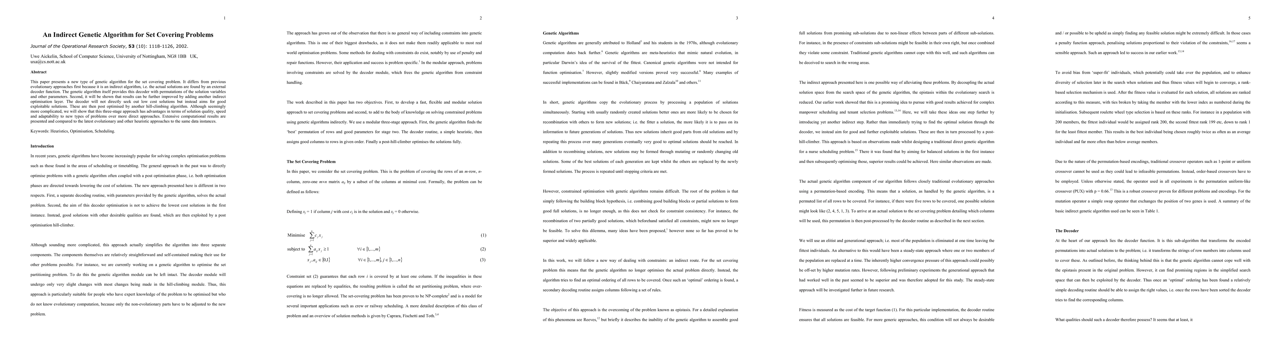 This paper introduces an indirect genetic algorithm for solving set covering problems, which combines multiple optimization techniques to improve solution quality and speed.