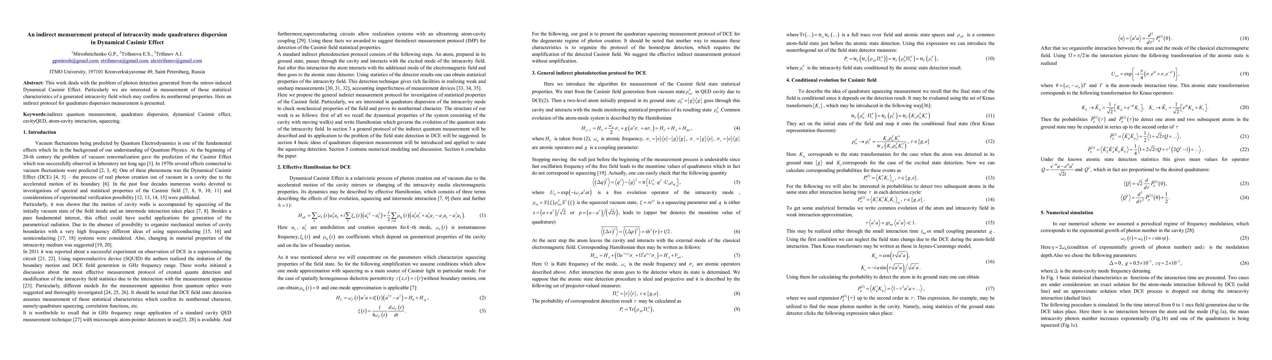 This work deals with the problem of photon detection generated from the mirror-induced Dynamical Casimir Effect. Particularly we are interested in measurement of those statistical characteristics of a generated intracavity field which may confirm its nonthermal properties. Here an indirect protocol for quadrature dispersion measurement is presented.