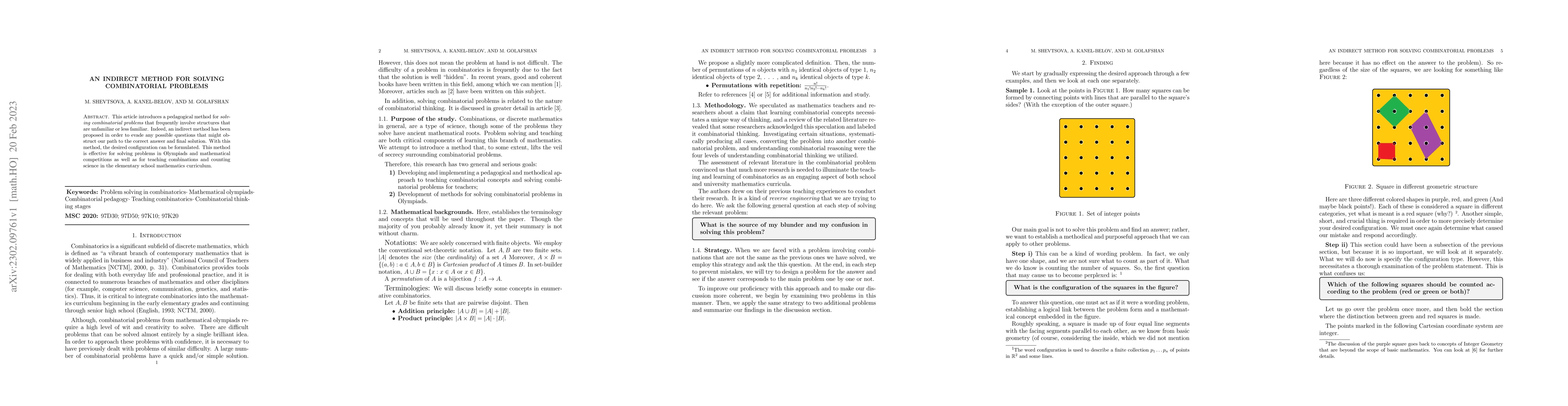 This paper proposes an indirect method for solving unfamiliar combinatorial problems, aiming to guide students through the solution without encountering obstacles. The method is particularly useful for Olympiads, competitions, and elementary school mathematics education.