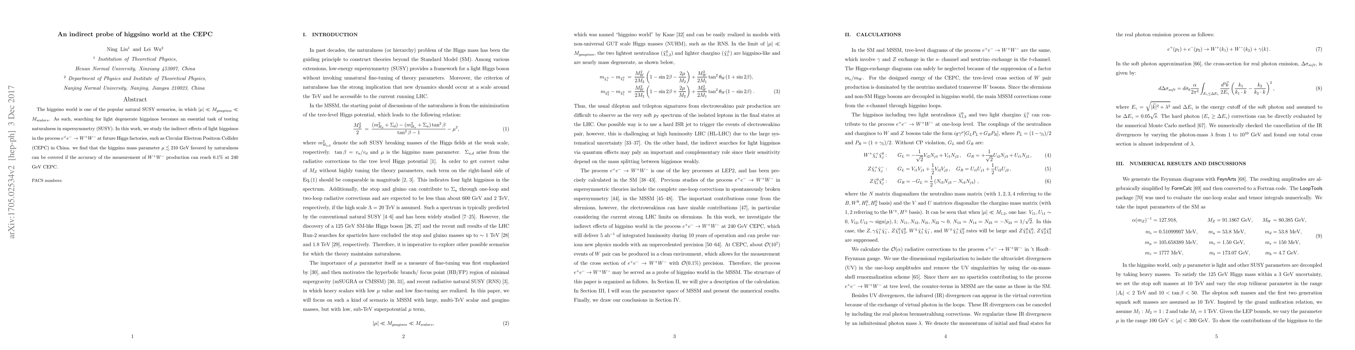 The higgsino world is one of the popular natural SUSY scenarios, in which $|\mu| \ll M_{gauginos} \ll M_{scalars}$. As such, searching for light degenerate higgsinos becomes an essential task of testing naturalness in supersymmetry (SUSY). In this work, we study the indirect effects of light higgsinos in the process $e^+e^- \to W^+W^-$ at future Higgs factories, such as Circular Electron Positron Collider (CEPC) in China. we find that the higgsino mass parameter $\mu \lesssim 210$ GeV favored by naturalness can be covered if the accuracy of the measurement of $W^+W^-$ production can reach 0.1\% at 240 GeV CEPC.