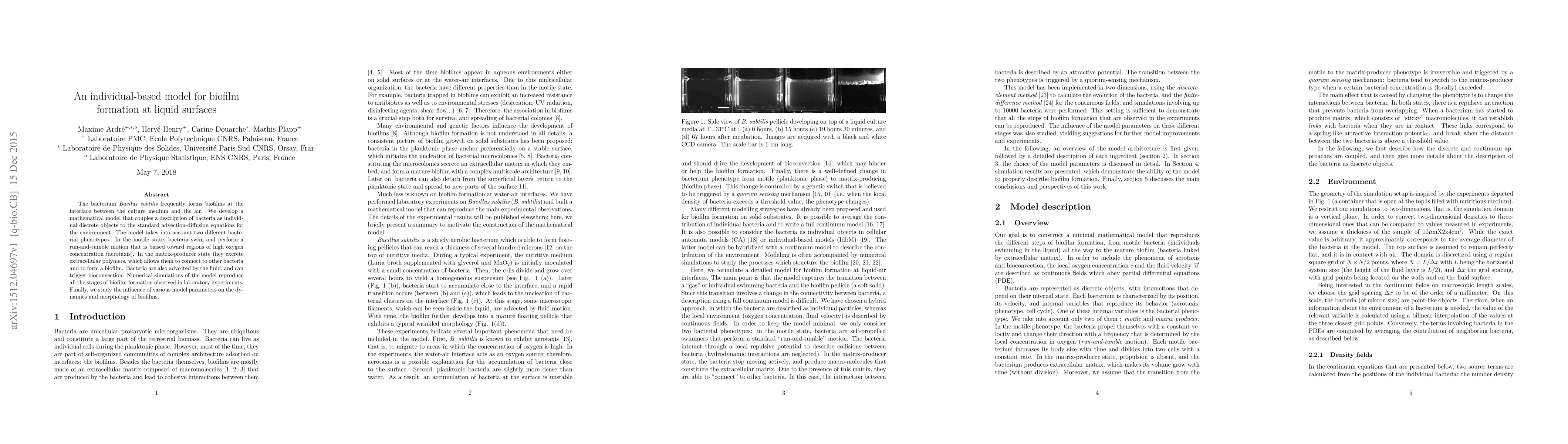 The bacterium {\em Bacilus subtilis} frequently forms biofilms at the interface between the culture medium and the air. We develop a mathematical model that couples a description of bacteria as individual discrete objects to the standard advection-diffusion equations for the environment. The model takes into account two different bacterial phenotypes. In the motile state, bacteria swim and perform a run-and-tumble motion that is biased toward regions of high oxygen concentration (aerotaxis). In the matrix-producer state they excrete extracellular polymers, which allows them to connect to other bacteria and to form a biofilm. Bacteria are also advected by the fluid, and can trigger bioconvection. Numerical simulations of the model reproduce all the stages of biofilm formation observed in laboratory experiments. Finally, we study the influence of various model parameters on the dynamics and morphology of biofilms.