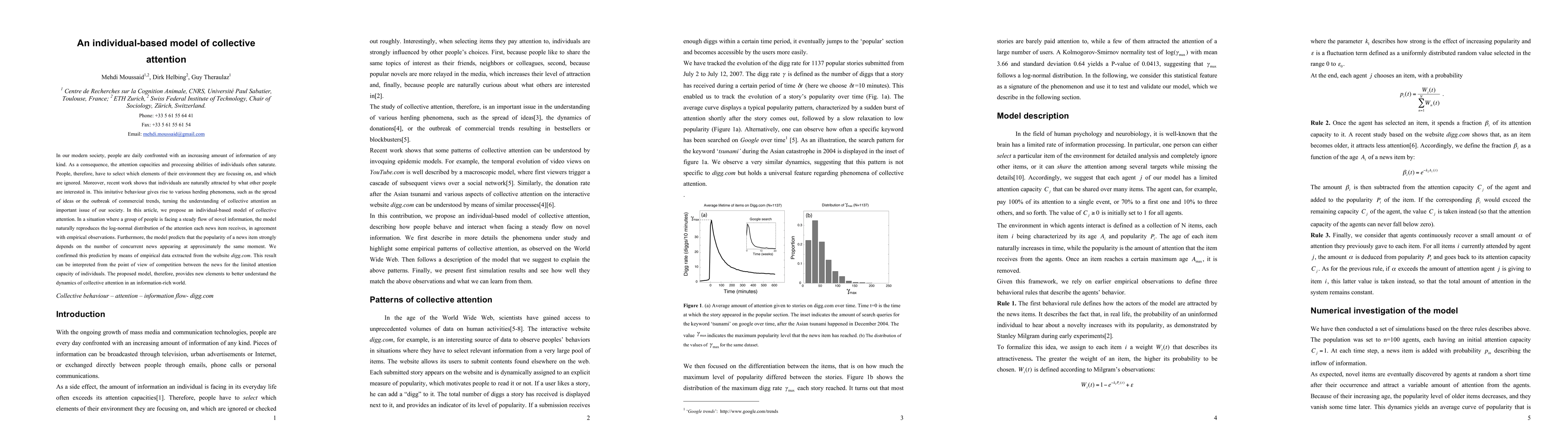 In our modern society, people are daily confronted with an increasing amount of information of any kind. As a consequence, the attention capacities and processing abilities of individuals often saturate. People, therefore, have to select which elements of their environment they are focusing on, and which are ignored. Moreover, recent work shows that individuals are naturally attracted by what other people are interested in. This imitative behaviour gives rise to various herding phenomena, such as the spread of ideas or the outbreak of commercial trends, turning the understanding of collective attention an important issue of our society. In this article, we propose an individual-based model of collective attention. In a situation where a group of people is facing a steady flow of novel information, the model naturally reproduces the log-normal distribution of the attention each news item receives, in agreement with empirical observations. Furthermore, the model predicts that the popularity of a news item strongly depends on the number of concurrent news appearing at approximately the same moment. We confirmed this prediction by means of empirical data extracted from the website digg.com. This result can be interpreted from the point of view of competition between the news for the limited attention capacity of individuals. The proposed model, therefore, provides new elements to better understand the dynamics of collective attention in an information-rich world.