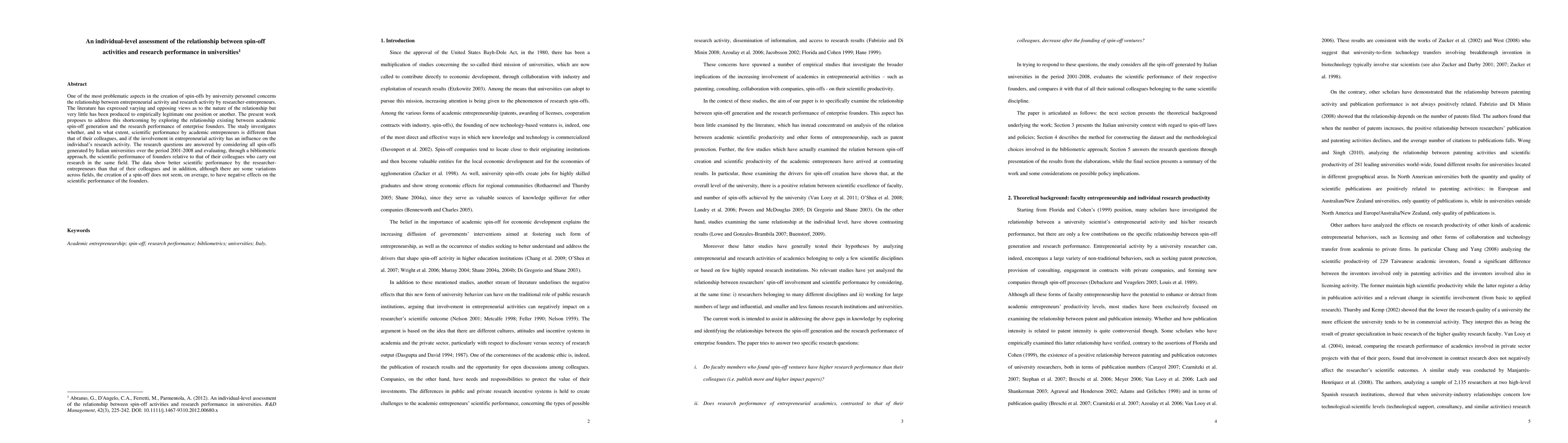 This study investigates the relationship between spin-off activities and research performance of university researcher-entrepreneurs in Italy from 2001-2008. The findings indicate that academic entrepreneurs exhibit better scientific performance compared to their peers, and spin-off creation generally does not negatively impact their research activity.