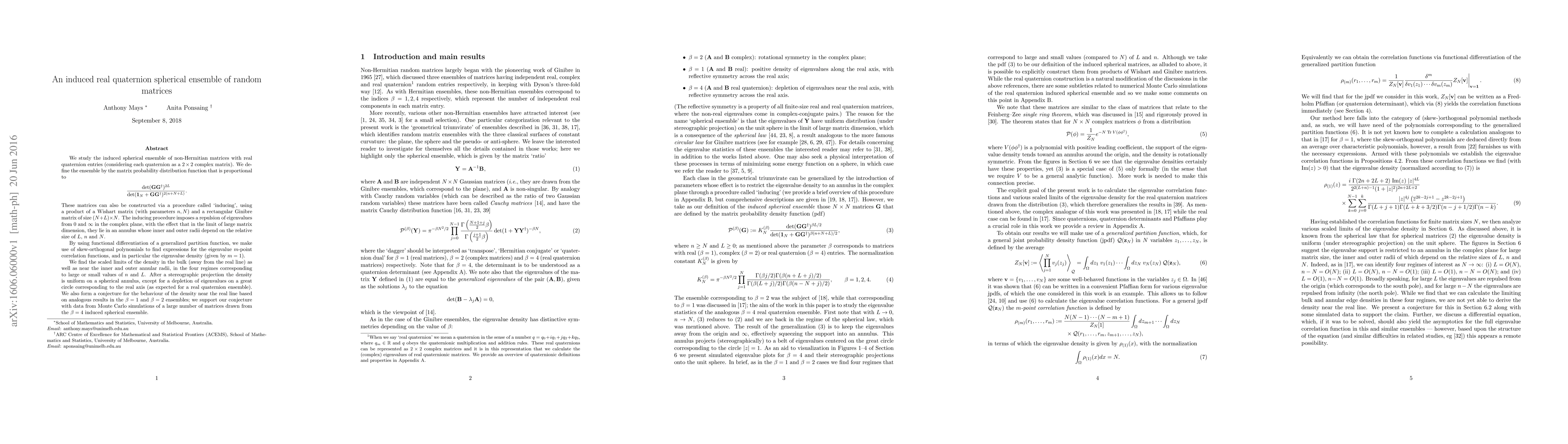 This paper investigates an induced spherical ensemble of random matrices with real quaternion entries, defined by a specific matrix probability distribution function. The study reveals eigenvalue repulsion and derives expressions for the eigenvalue density and correlation functions using skew-orthogonal polynomials, showing uniform density on a spherical annulus with a depletion near the real axis.