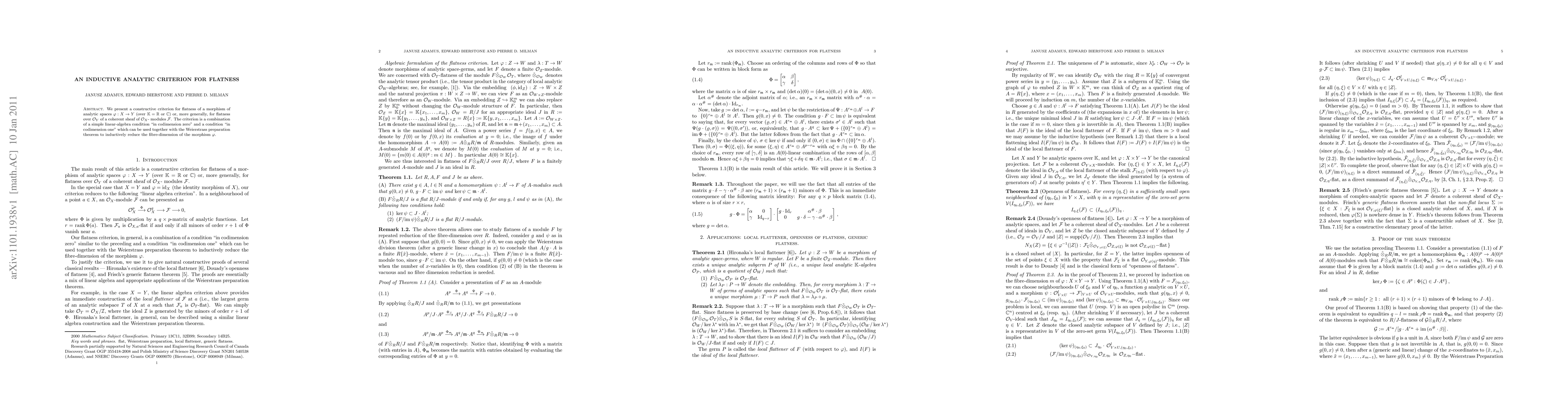 This paper introduces a constructive criterion for determining flatness in morphisms of analytic spaces, combining linear-algebra conditions in codimension zero and a codimension one condition, utilizing the Weierstrass preparation theorem for inductive dimension reduction.