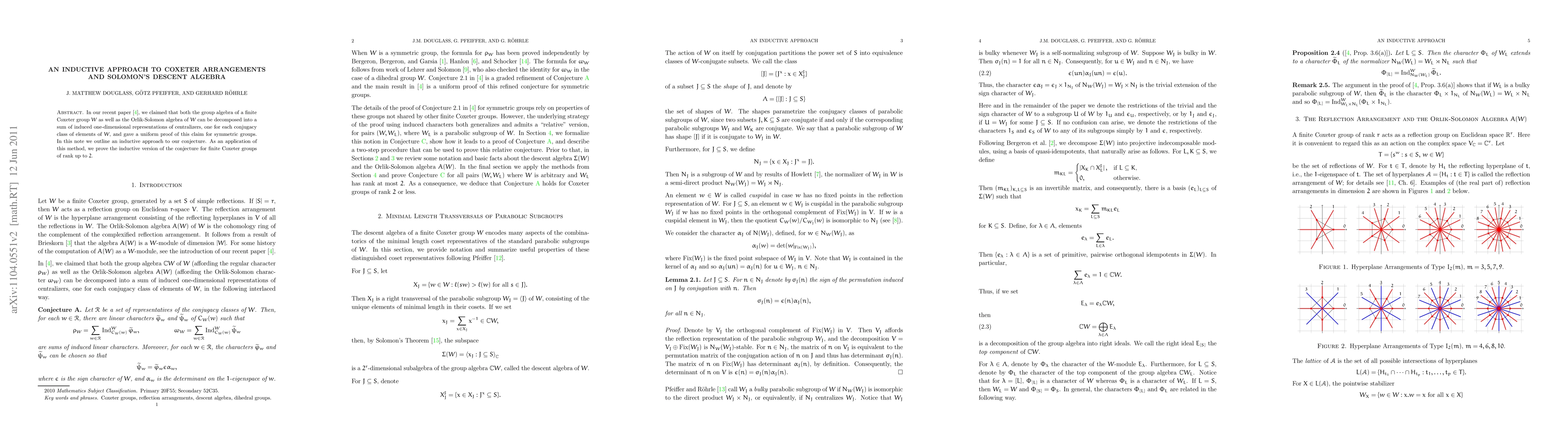 In a recent paper we claimed that both the group algebra of a finite Coxeter group $W$ as well as the Orlik-Solomon algebra of $W$ can be decomposed into a sum of induced one-dimensional representations of centralizers, one for each conjugacy class of elements of $W$, and gave a uniform proof of this claim for symmetric groups. In this note we outline an inductive approach to our conjecture. As an application of this method, we prove the inductive version of the conjecture for finite Coxeter groups of rank up to 2.