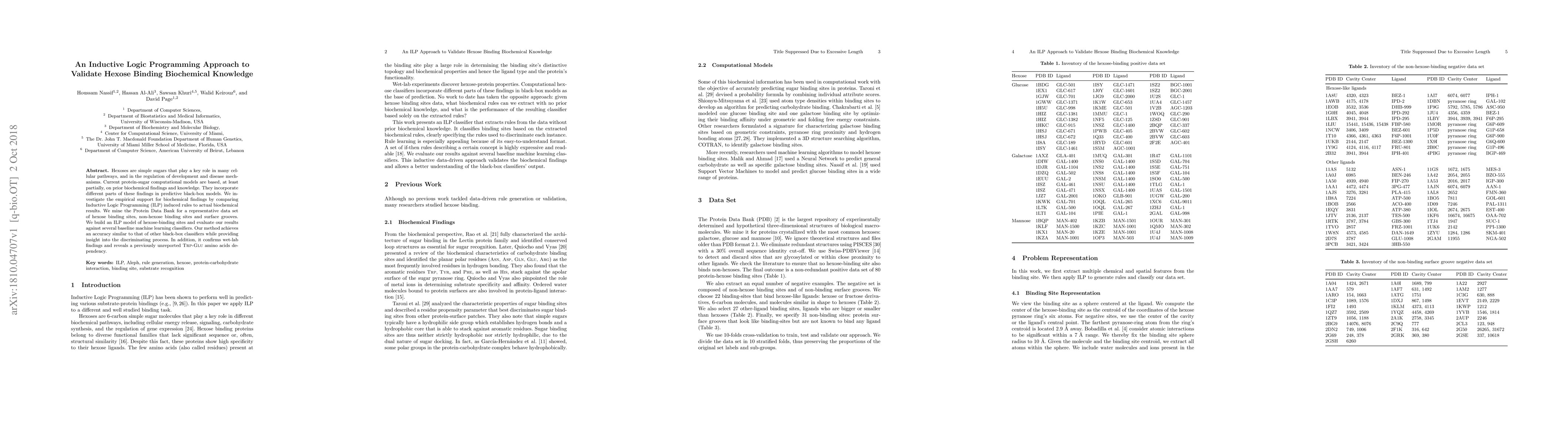 Hexoses are simple sugars that play a key role in many cellular pathways, and in the regulation of development and disease mechanisms. Current protein-sugar computational models are based, at least partially, on prior biochemical findings and knowledge. They incorporate different parts of these findings in predictive black-box models. We investigate the empirical support for biochemical findings by comparing Inductive Logic Programming (ILP) induced rules to actual biochemical results. We mine the Protein Data Bank for a representative data set of hexose binding sites, non-hexose binding sites and surface grooves. We build an ILP model of hexose-binding sites and evaluate our results against several baseline machine learning classifiers. Our method achieves an accuracy similar to that of other black-box classifiers while providing insight into the discriminating process. In addition, it confirms wet-lab findings and reveals a previously unreported Trp-Glu amino acids dependency.