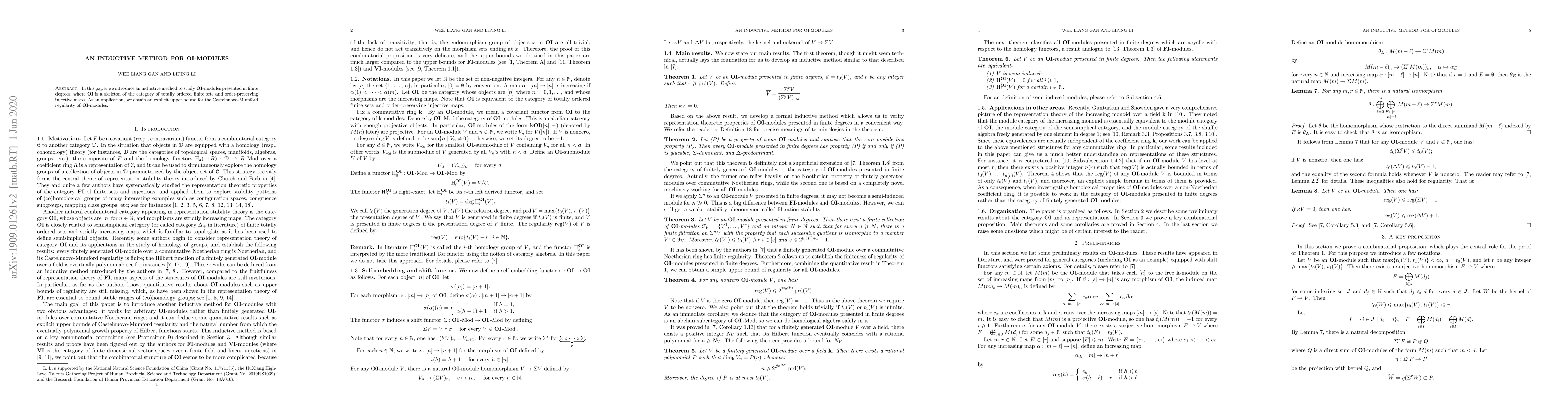 In this paper we introduce an inductive method to study $\mathrm{OI}$-modules presented in finite degrees, where $\mathrm{OI}$ is a skeleton of the category of finitely totally ordered sets and strictly increasing maps. As an application, we obtain an explicit upper bound for the Castelnuovo-Mumford regularity of $\mathrm{OI}$-modules.