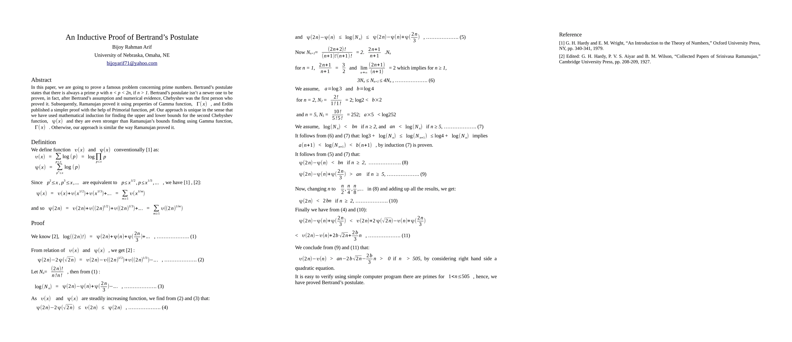 In this paper, we are going to prove a famous problem concerning prime numbers. Bertrand postulate states that there is always a prime p with n < p < 2n, if n > 1. Bertrand postulate is not a newer one to be proven, in fact, after his assumption and numerical evidence, Chebyshev was the first person who proved it. Subsequently, Ramanujan proved it using properties of Gamma function, and Erd\"os published a simpler proof with the help of Primorial function, p#. Our approach is unique in the sense that we have used mathematical induction for finding the upper and lower bounds for the second Chebyshev function, and they are even stronger than Ramanujan bounds finding using Gamma function. Otherwise, our approach is similar the way Ramanujan proved it.