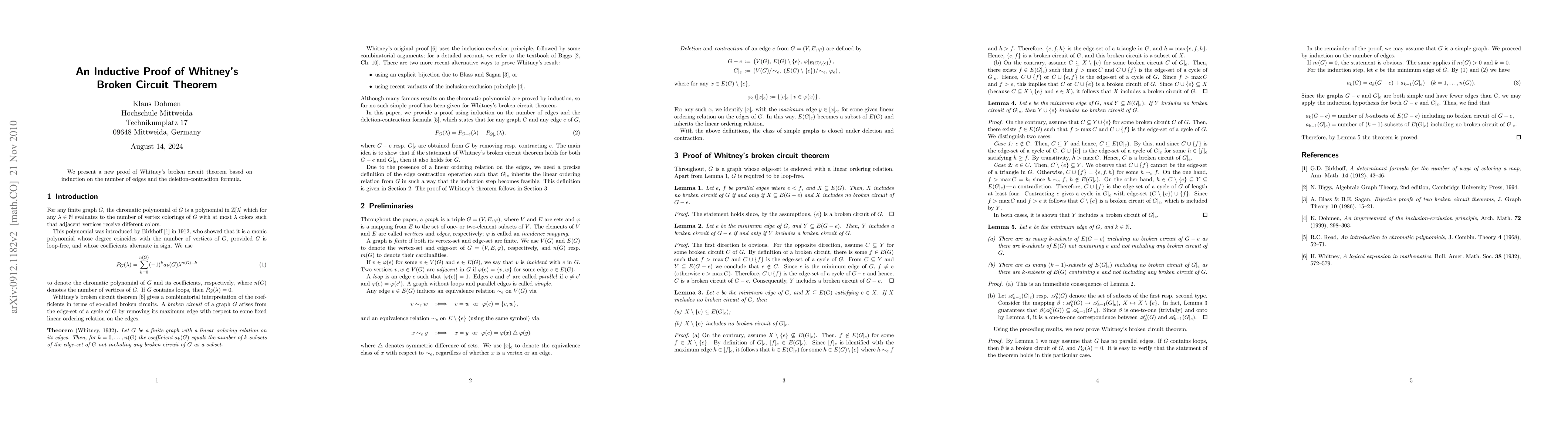 Summary: This paper introduces an inductive proof of Whitney's broken circuit theorem, utilizing the deletion-contraction formula and relying on the number of edges to establish the theorem's validity.