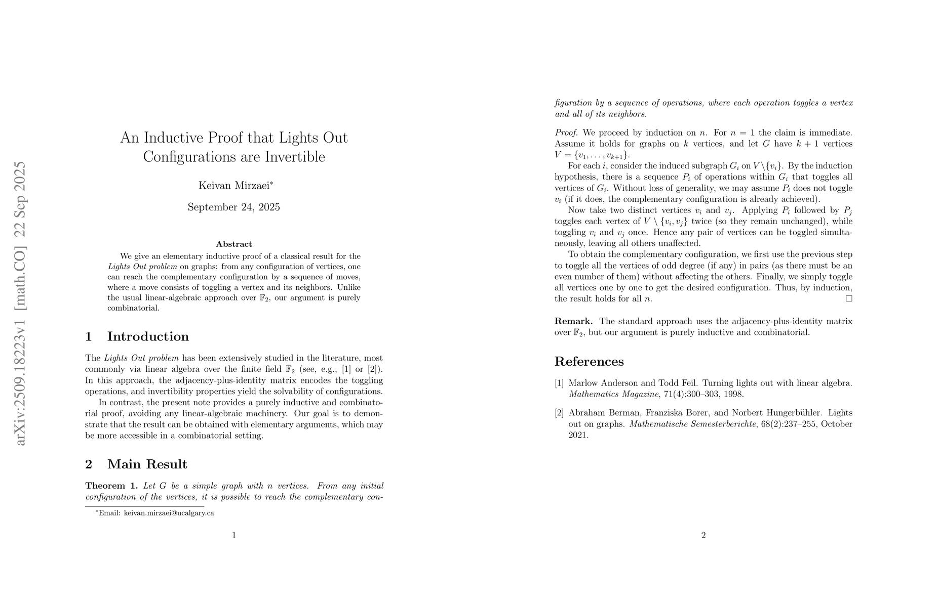 The paper provides a purely inductive and combinatorial proof of the invertibility of Lights, offering an alternative to the standard linear-algebraic approach.