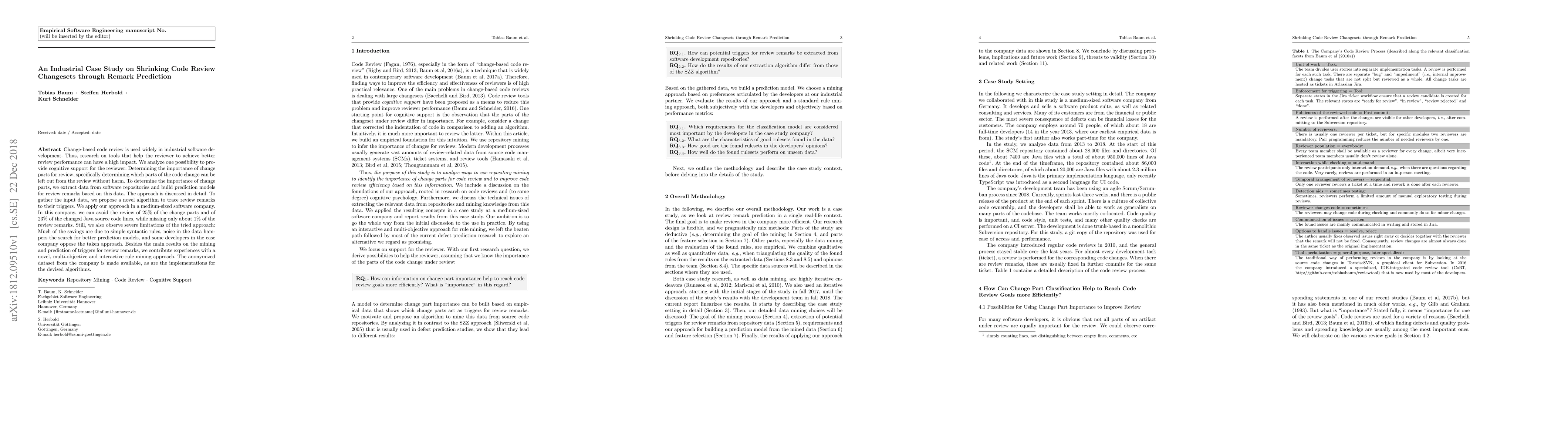 This paper investigates a method to predict review remarks in code review processes, aiming to reduce the volume of code changes that need to be reviewed. The authors develop a novel algorithm to trace remarks to their triggers and apply it in a medium-sized software company, achieving a 25% reduction in reviewed change parts and a 23% reduction in reviewed code lines with minimal loss of remarks. However, they also highlight limitations such as reliance on simple syntactic rules and developer resistance.
