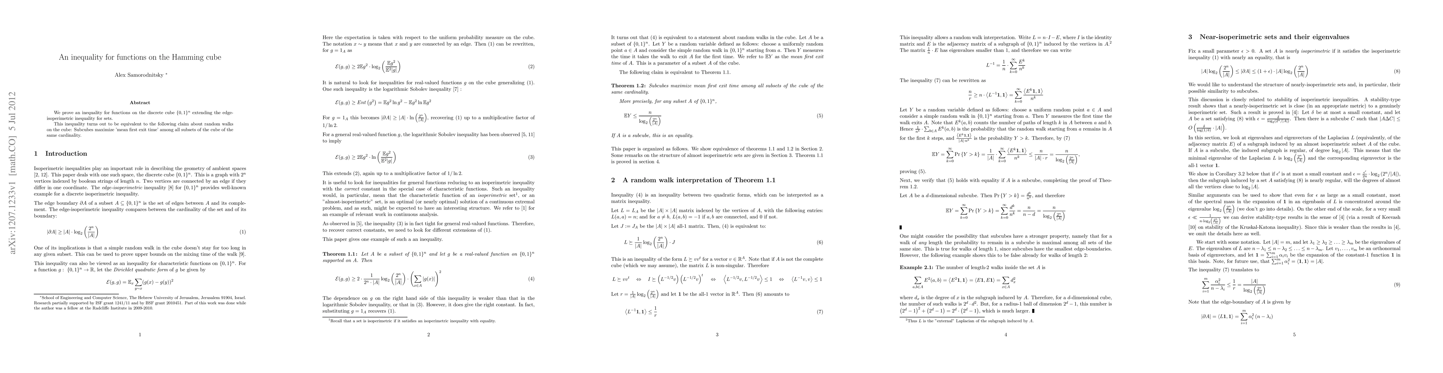Summary: The paper establishes an inequality for functions on the Hamming cube, extending the edge-isoperimetric inequality for sets, and shows its equivalence to the claim that subcubes maximize the mean first exit time in random walks on the cube.