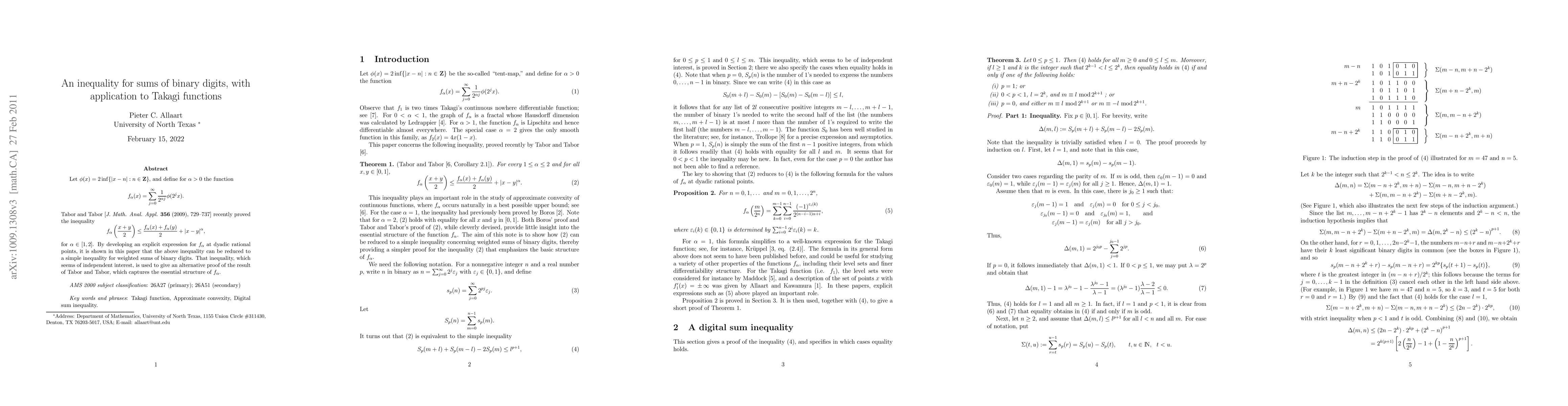 This paper considers a parametrized family of generalized Takagi functions f_p with parameter p. Tabor and Tabor [J. Math. Anal. Appl. 356 (2009), 729-737] recently proved that for p in [1,2], f_p is (1,p)-midconvex. We give a simpler proof of this result by developing an explicit expression for f_p at dyadic rational points and showing that (1,p)-midconvexity of f_p reduces to a simple inequality for weighted sums of binary digits.