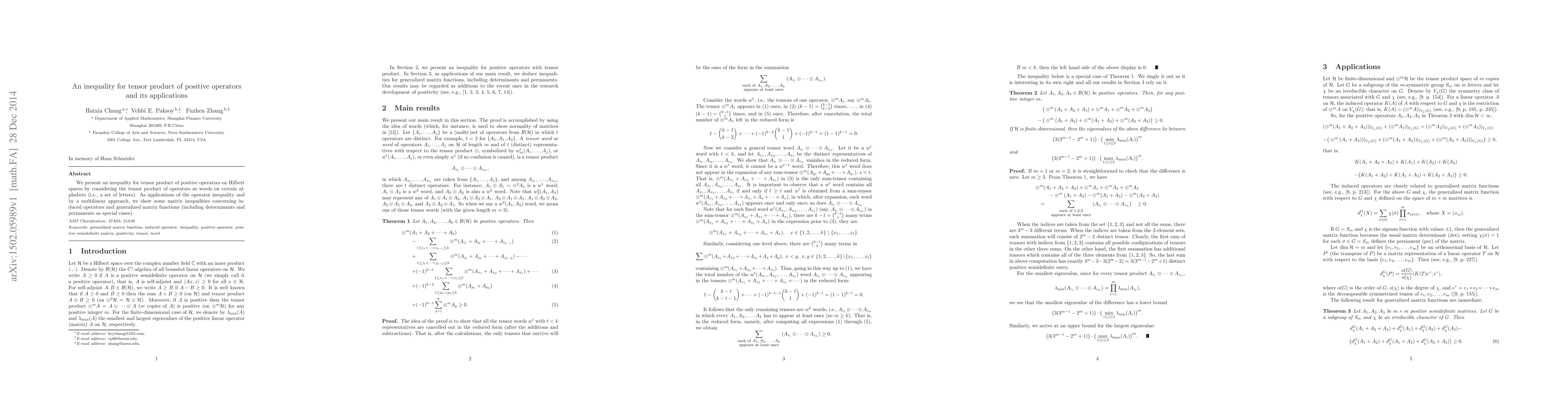 This research introduces an inequality for the tensor product of positive operators on Hilbert spaces, viewed as 'words' from an alphabet. It demonstrates applications via multilinear methods, proving various matrix inequalities involving induced operators and generalized matrix functions, such as determinants and permanents.
