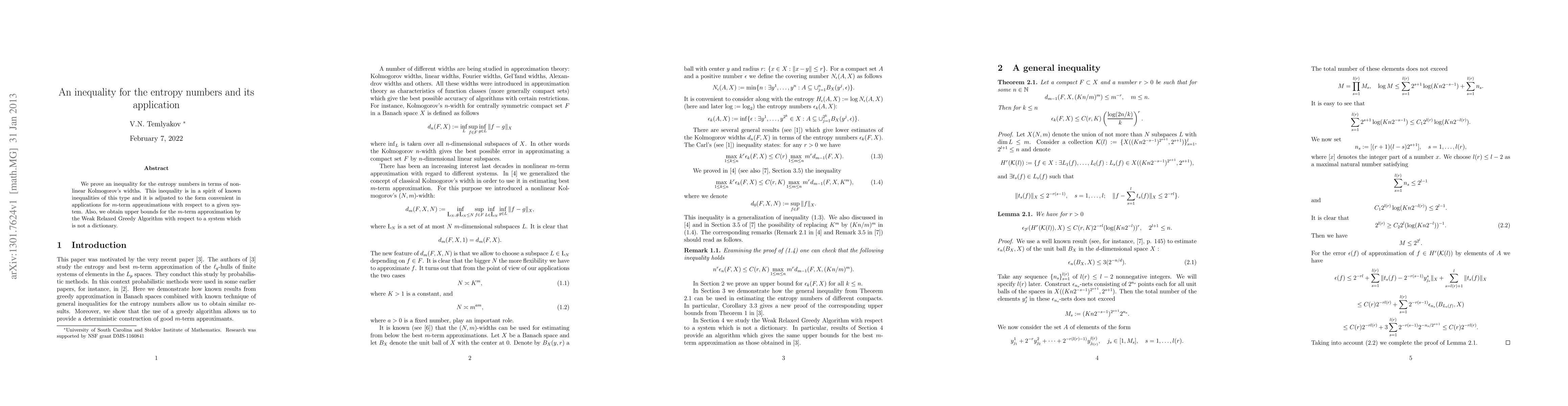 Researchers prove an inequality for entropy numbers in terms of nonlinear Kolmogorov's widths, providing upper bounds for m-term approximations using the Weak Relaxed Greedy Algorithm.