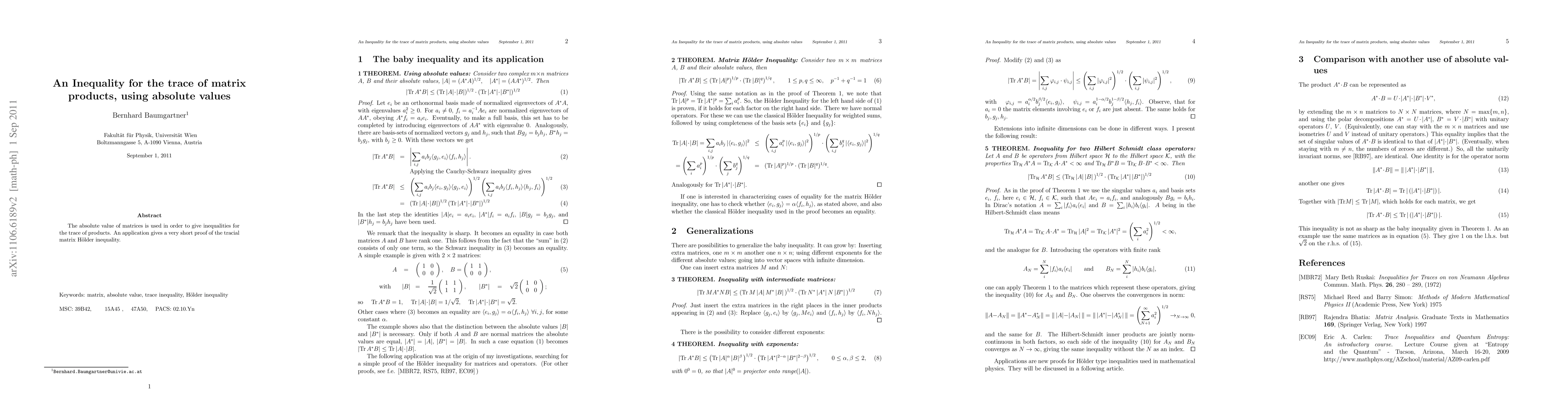 Summary: This paper presents an inequality for the trace of matrix products utilizing absolute values of matrices. It also provides a concise proof of the tracial matrix Hölder inequality through this novel approach.