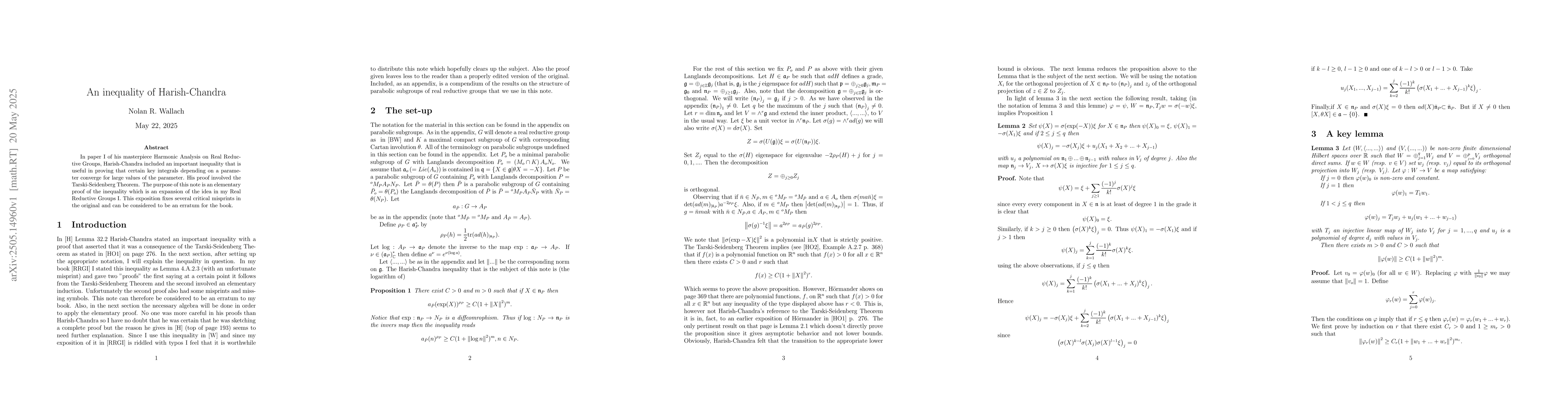 The paper provides an elementary proof of Harish-Chandra's inequality, correcting misprints from the original work and expanding on an idea presented in 'Real Reductive Groups I'.