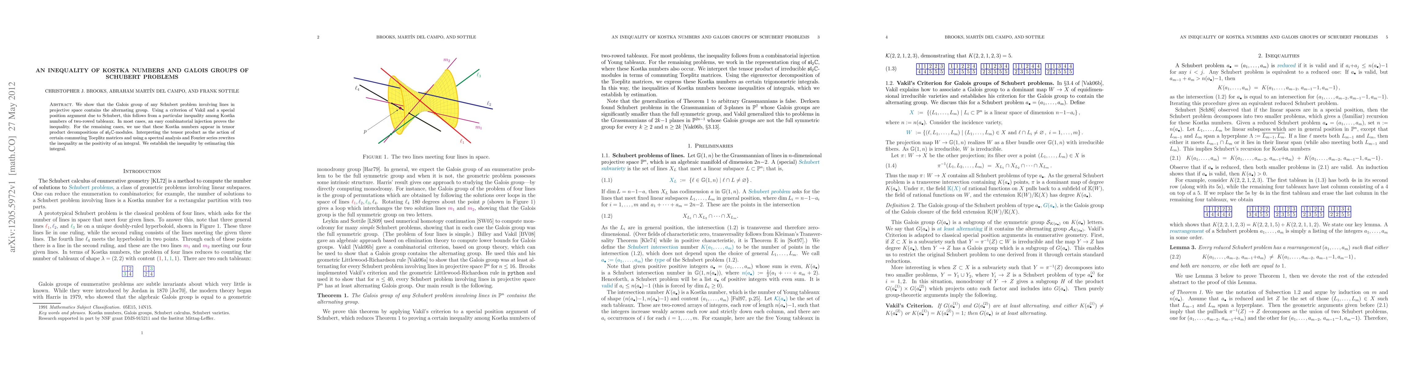 This research paper demonstrates that the Galois group of any Schubert problem concerning lines in projective space includes the alternating group. The authors prove a specific inequality among Kostka numbers of two-rowed tableaux using combinatorial methods and spectral analysis of sl_2(C)-modules. They interpret tensor products as Toeplitz matrix actions, apply Fourier series, and estimate an integral to establish the inequality.