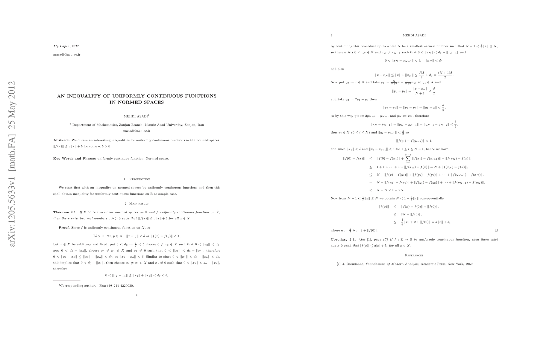 Summary: This paper establishes an inequality for uniformly continuous functions in normed spaces, demonstrating that $\|f(x)\|\leq a\|x\|+b$ for positive constants $a$ and $b$. This provides a useful bound for analyzing such functions.