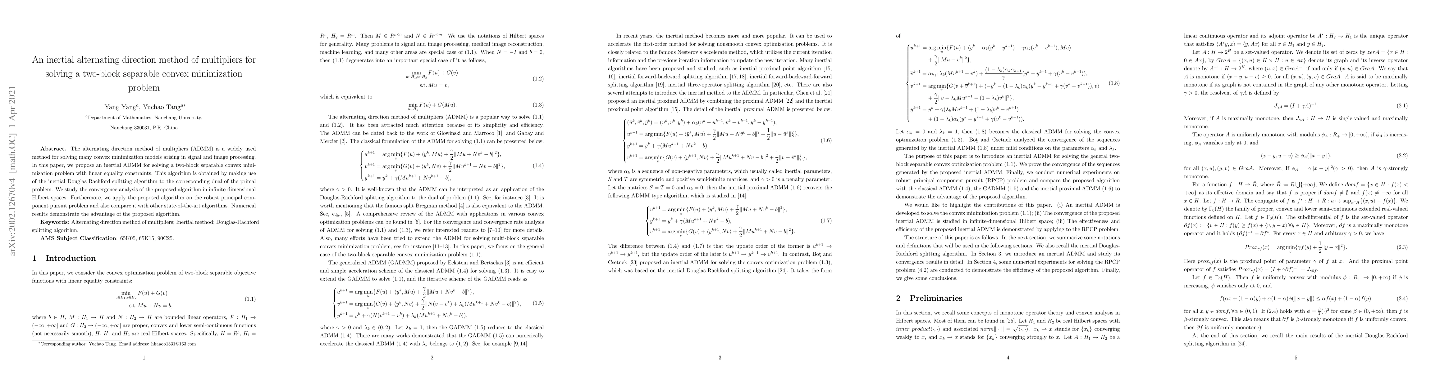 This paper proposes an inertial variant of ADMM for solving two-block separable convex minimization problems with linear equality constraints, leveraging the inertial Douglas-Rachford splitting algorithm. The convergence of the algorithm is analyzed in infinite-dimensional Hilbert spaces, and its performance is demonstrated through the robust principal component pursuit problem, showing superior results compared to other methods.