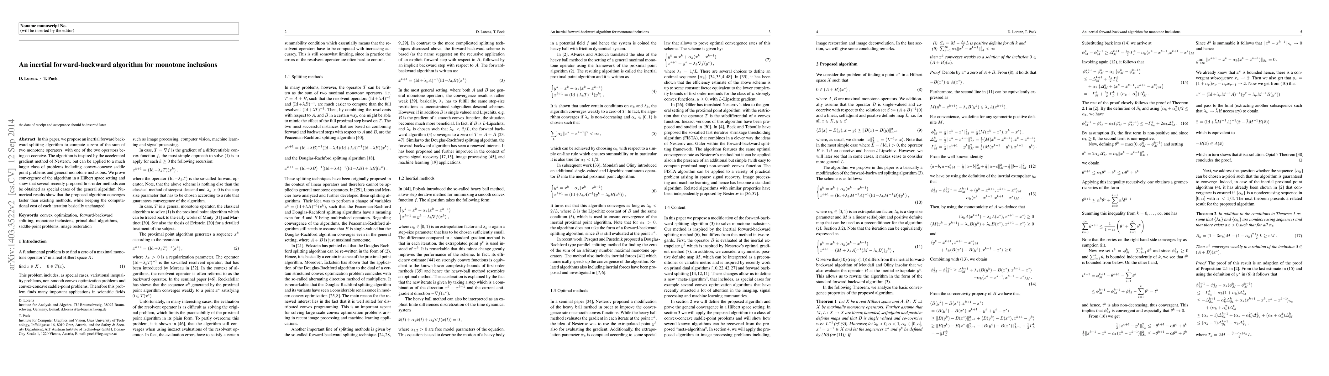 This paper introduces an inertial forward-backward splitting algorithm for solving monotone inclusions, extending its applicability to convex-concave saddle point problems. The proposed method demonstrates faster convergence compared to existing first-order methods while maintaining consistent computational costs per iteration.