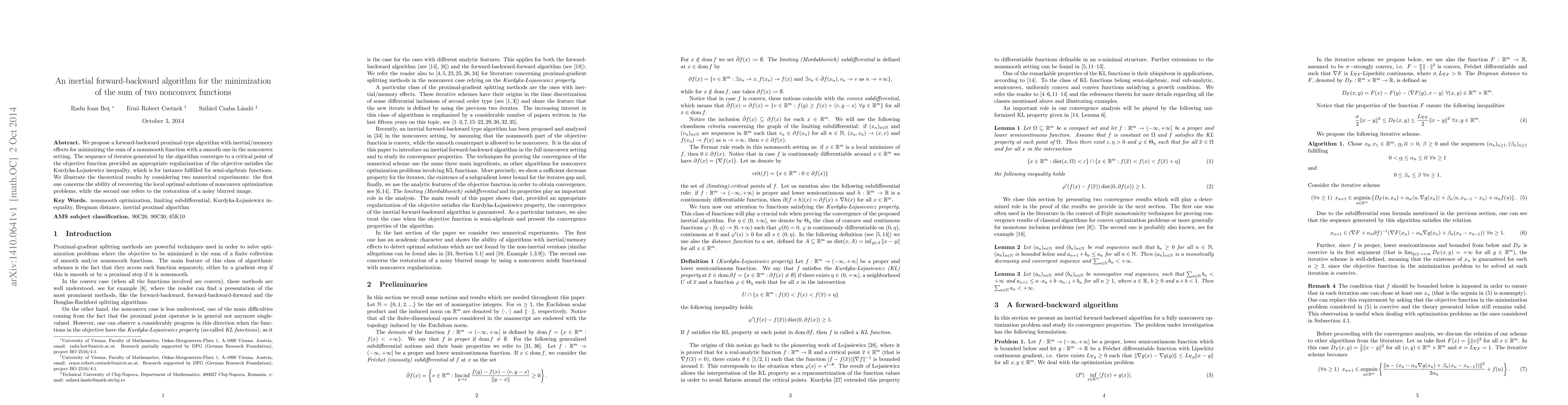 A new algorithm is proposed for minimizing the sum of two nonconvex functions, achieving convergence under certain conditions, with applications in recovering local optimal solutions and restoring blurry images.