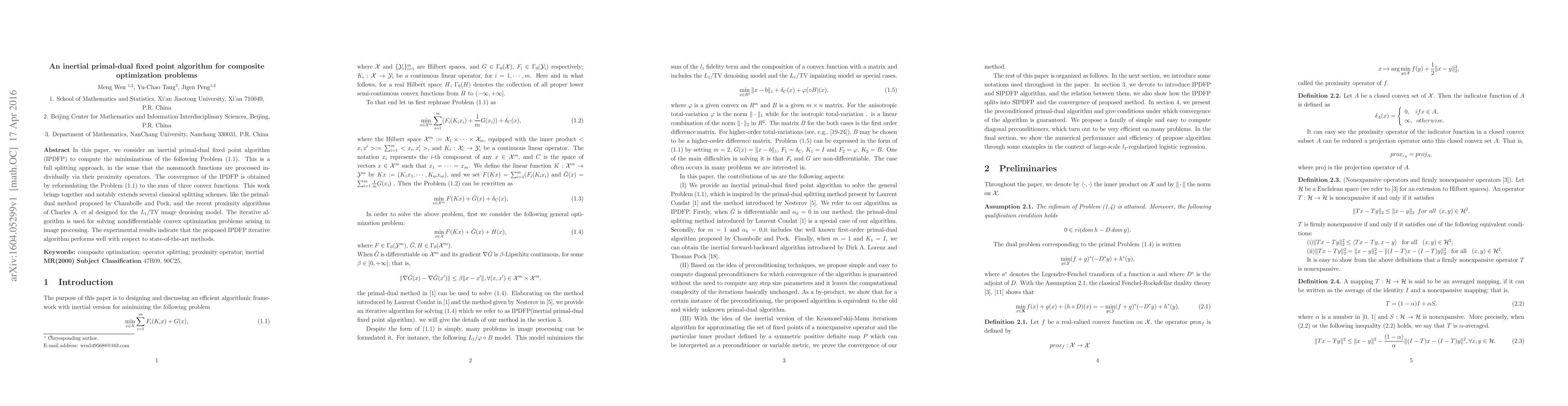 This paper introduces an inertial primal-dual fixed point algorithm (IPDFP) for solving composite optimization problems, reformulating the problem into the sum of three convex functions. The proposed method extends classical splitting schemes and demonstrates superior performance in image processing tasks compared to state-of-the-art methods.