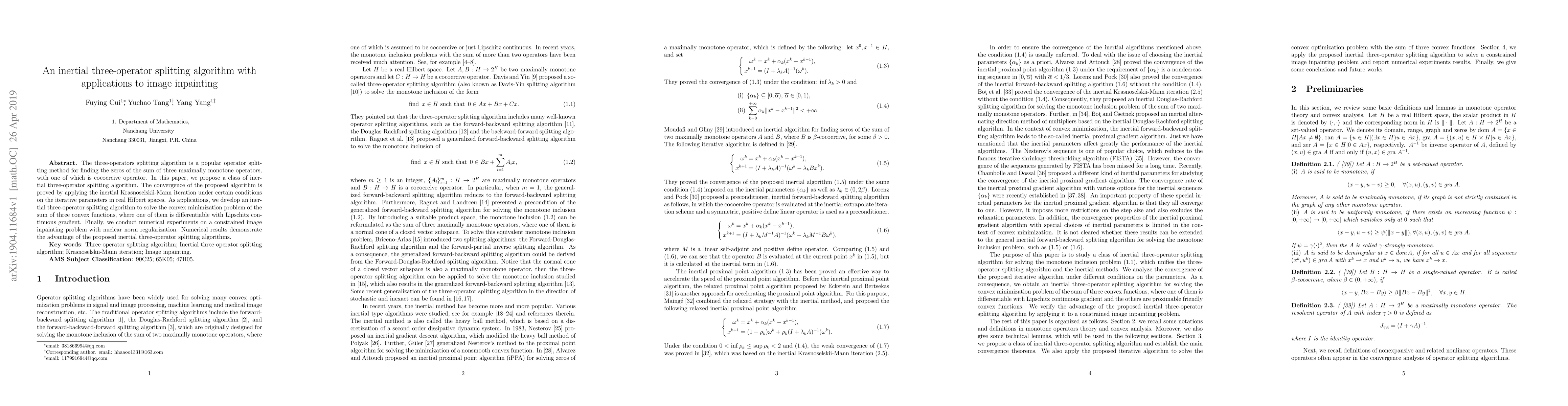 This paper proposes an inertial three-operator splitting algorithm for solving convex minimization problems, proving its convergence in real Hilbert spaces. The method is applied to constrained image inpainting with nuclear norm regularization, demonstrating its effectiveness through numerical experiments.