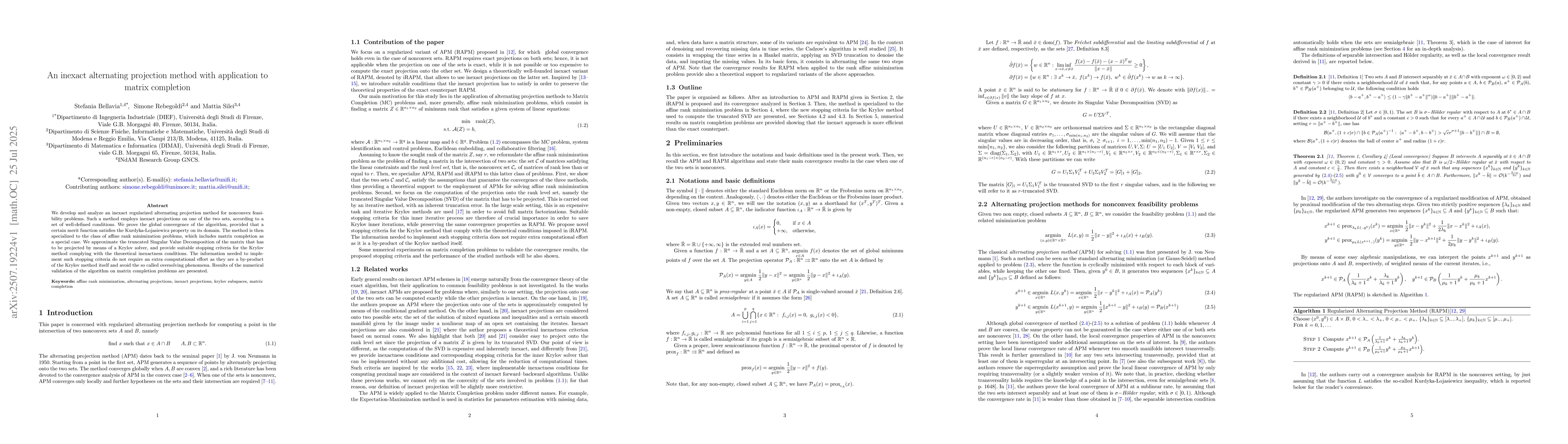 We develop and analyze an inexact regularized alternating projection method for nonconvex feasibility problems. Such a method employs inexact projections on one of the two sets, according to a set of well-defined conditions. We prove the global convergence of the algorithm, provided that a certain merit function satisfies the Kurdyka-Lojasiewicz property on its domain. The method is then specialized to the class of affine rank minimization problems, which includes matrix completion as a special case. We approximate the truncated Singular Value Decomposition of the matrix that has to be projected by means of a Krylov solver, and provide suitable stopping criteria for the Krylov method complying with the theoretical inexactness conditions. The information needed to implement such stopping criteria do not require an extra computational effort as they are a by-product of the Krylov method itself and avoid the so called oversolving phenomena. Results of the numerical validation of the algorithm on matrix completion problems are presented.