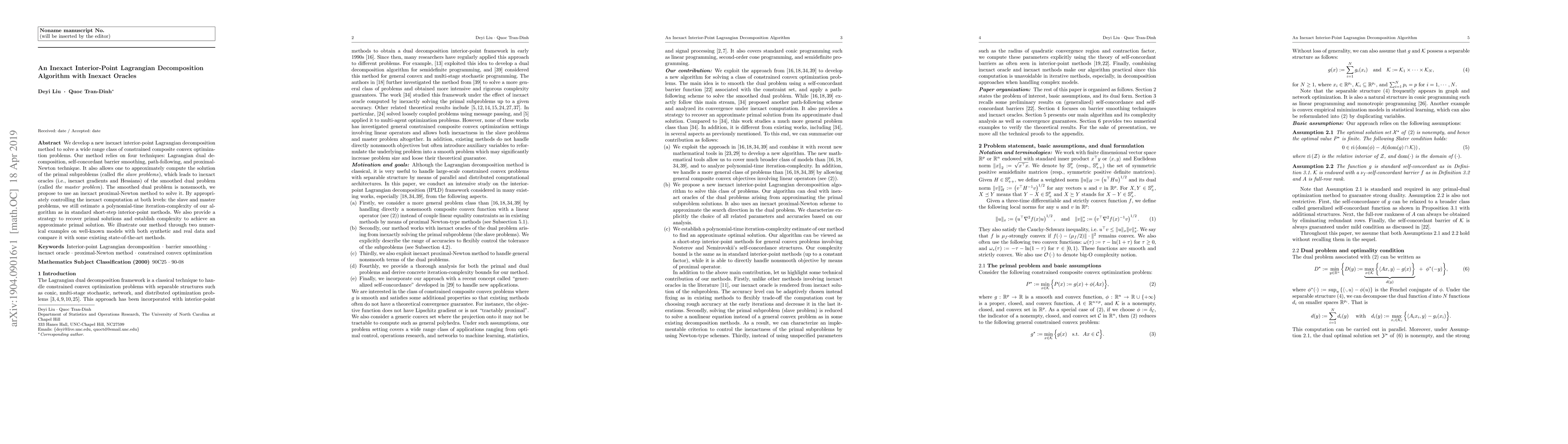 This paper introduces an inexact interior-point Lagrangian decomposition algorithm that employs techniques like self-concordant barrier smoothing and proximal-Newton methods to solve constrained composite convex optimization problems. The method allows for approximate solutions to subproblems, leading to inexact oracles, while still achieving polynomial-time complexity.