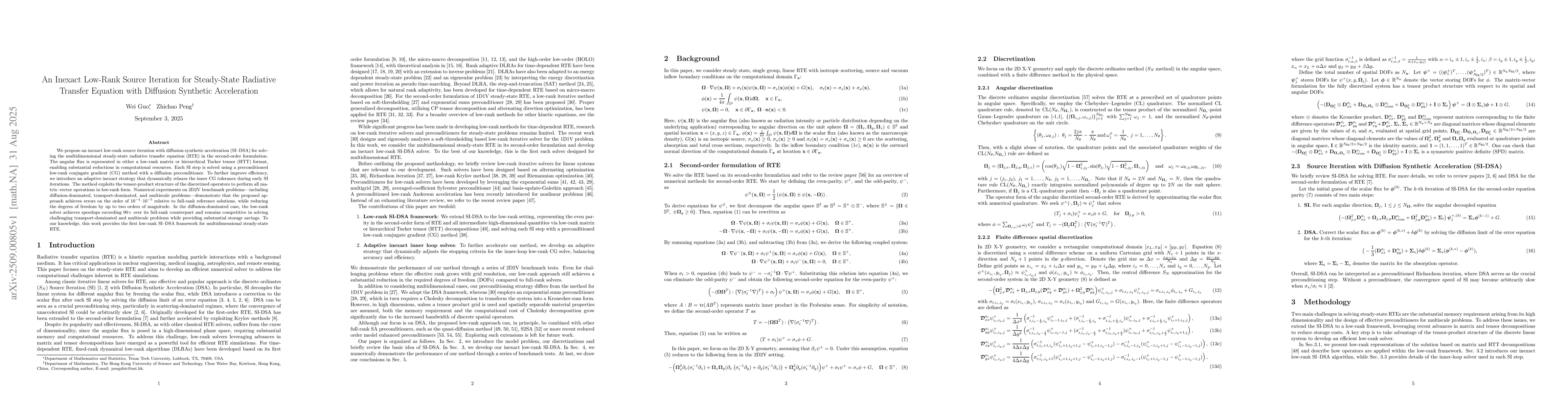 We propose an inexact low-rank source iteration with diffusion synthetic acceleration (SI-DSA) for solving the multidimensional steady-state radiative transfer equation (RTE) in the second-order formulation. The angular flux is represented in either a low-rank matrix or hierarchical Tucker tensor (HTT) format, enabling substantial reductions in computational resources. Each SI step is solved using a preconditioned low-rank conjugate gradient (CG) method with a diffusion preconditioner. To further improve efficiency, we introduce an adaptive inexact strategy that dynamically relaxes the inner CG tolerance during early SI iterations. The method exploits the tensor-product structure of the discretized operators to perform all matrix-vector operations in low-rank form. Numerical experiments on 2D2V benchmark problems, including diffusion-dominated, transport-dominated, and multiscale problems, demonstrate that the proposed approach achieves errors on the order of $10^{-4}$ to $10^{-5}$ relative to full-rank reference solutions, while reducing the degrees of freedom by up to two orders of magnitude. In the diffusion-dominated case, the low-rank solver achieves speedups exceeding $90\times$ over its full-rank counterpart and remains competitive in solving challenging transport-dominated and multiscale problems while providing substantial storage savings. To our knowledge, this work provides the first low-rank SI-DSA framework for multidimensional steady-state RTE.