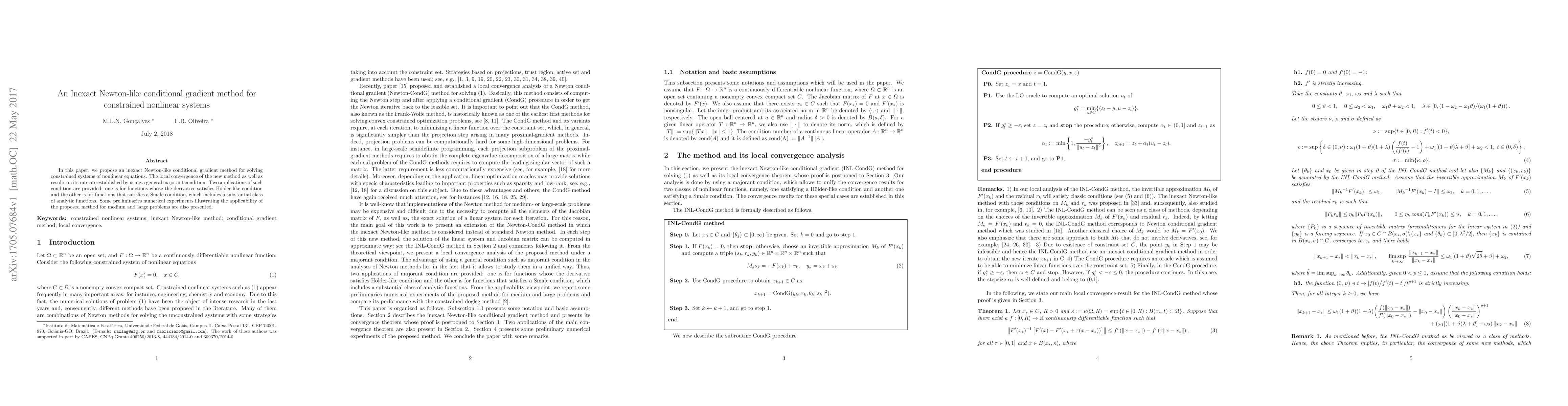 This paper proposes an inexact Newton-like conditional gradient method for solving constrained nonlinear systems, establishing its local convergence and rate under a general majorant condition. Numerical experiments demonstrate its effectiveness for medium to large-scale problems.