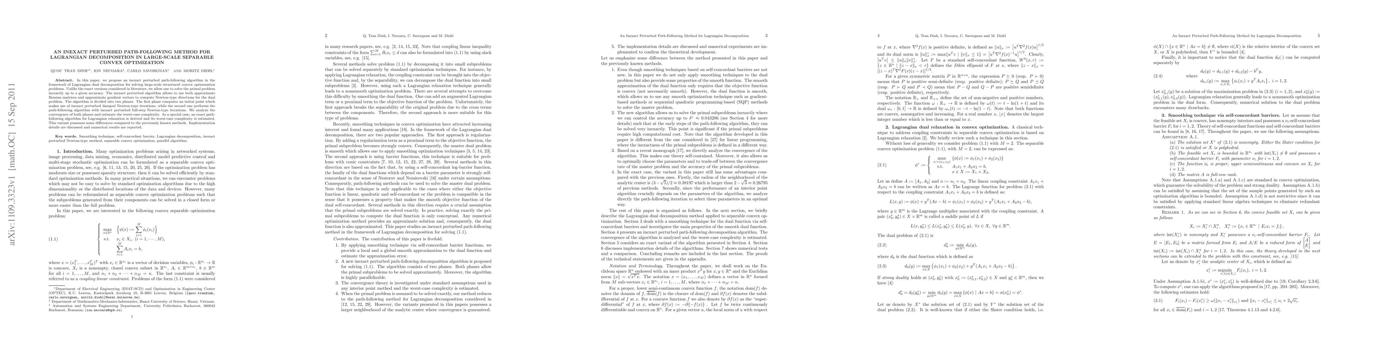 This paper introduces an inexact perturbed path-following algorithm for solving large-scale separable convex optimization problems using Lagrangian dual decomposition. The proposed method allows for inexact primal problem solutions and utilizes approximate Hessians and gradients, and is divided into an initial point computation phase and a path-following phase.