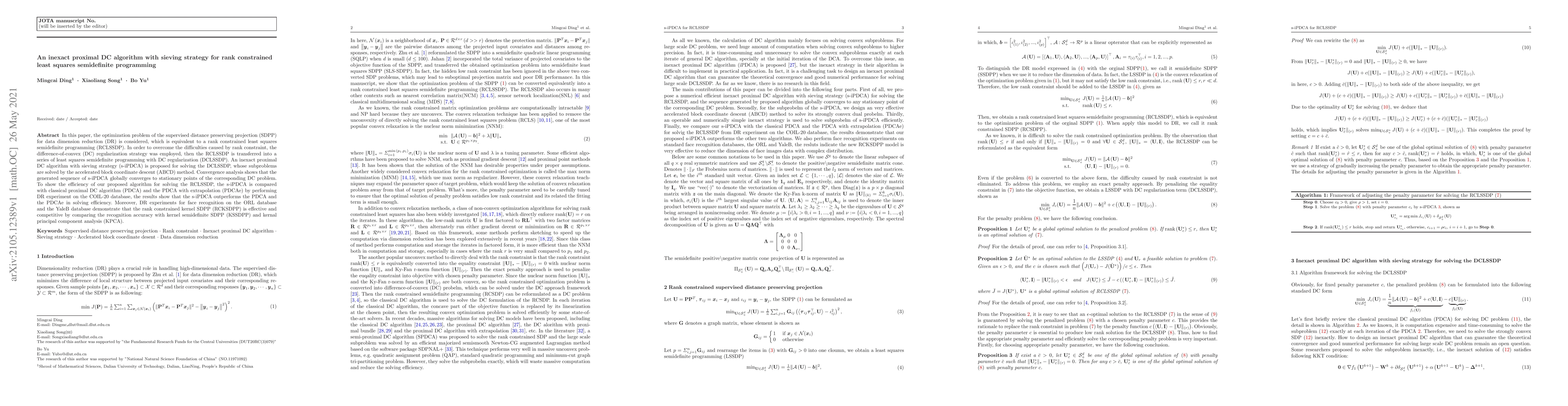 This paper proposes an inexact proximal DC algorithm with sieving strategy (s-iPDCA) for solving rank constrained least squares semidefinite programming (RCLSSDP), which is used in supervised distance preserving projection for data dimension reduction. The s-iPDCA outperforms classical proximal DC algorithms in efficiency and demonstrates competitive recognition accuracy in face recognition experiments.