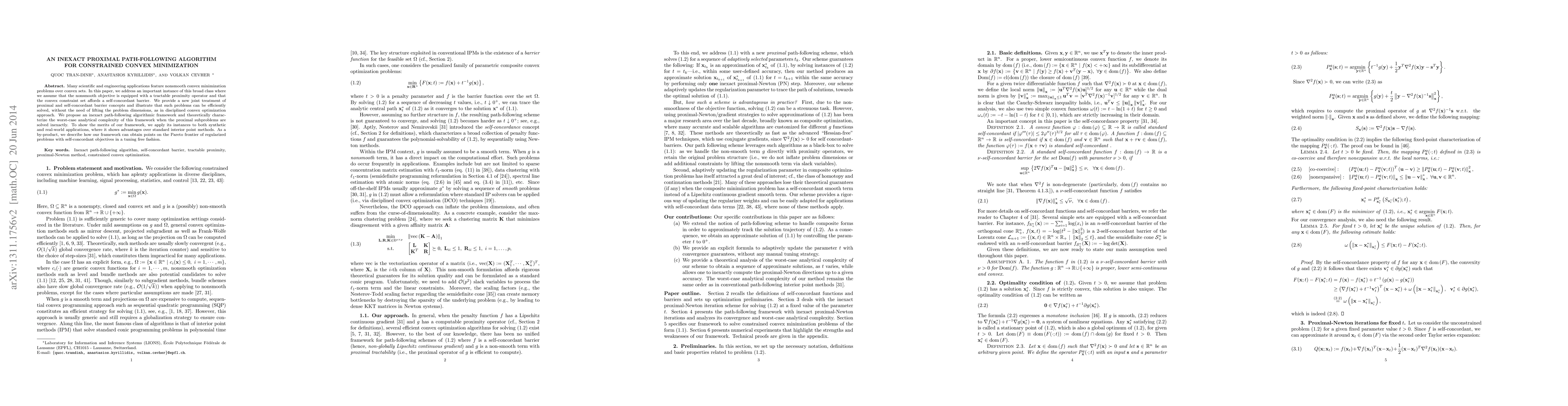 This paper introduces an inexact proximal path-following algorithm for solving constrained convex minimization problems involving nonsmooth objectives and self-concordant barrier constraints, demonstrating improved efficiency over standard interior point methods. The proposed framework allows for solving these problems without increasing problem dimensions, achieving better performance on both synthetic and real-world applications.