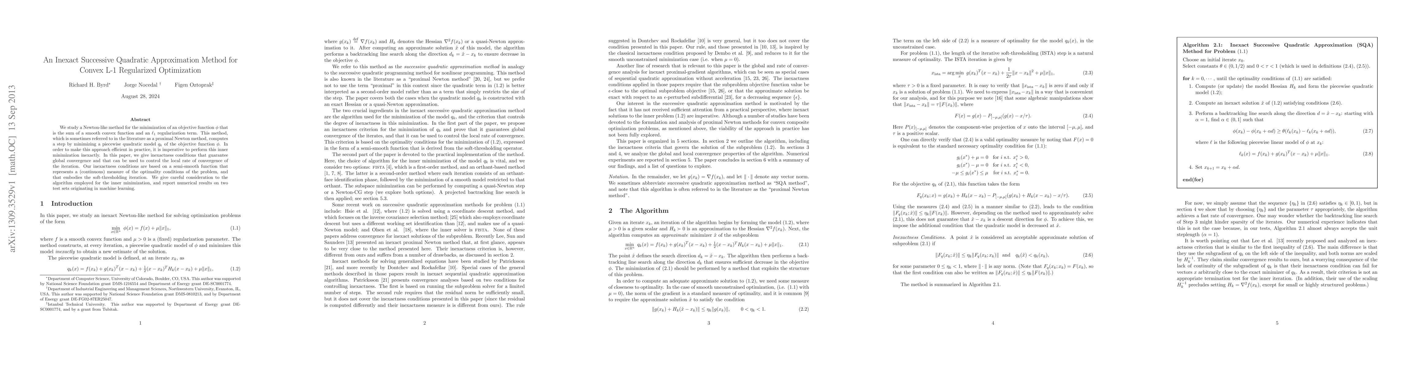This paper proposes an inexact successive quadratic approximation method for convex L-1 regularized optimization, employing a proximal Newton approach. It establishes inexactness conditions ensuring global convergence and local rate control, and reports numerical results demonstrating its effectiveness in machine learning applications.