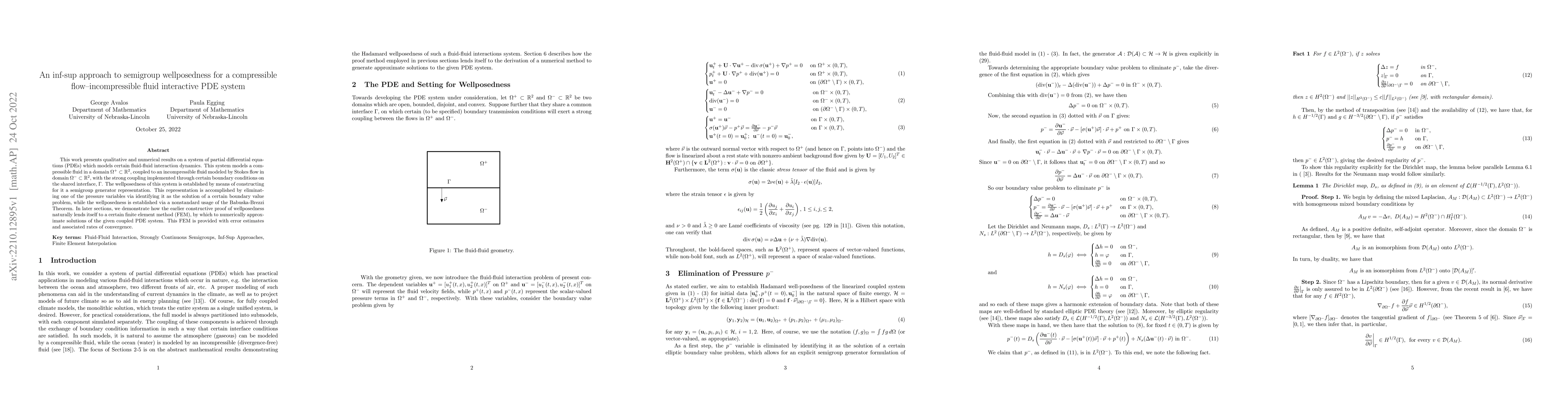 This paper establishes wellposedness for a coupled PDE system modeling compressible and incompressible fluid interaction using a semigroup generator approach and the Babuska-Brezzi Theorem. It also develops a finite element method for numerical approximation, providing error estimates and convergence rates.