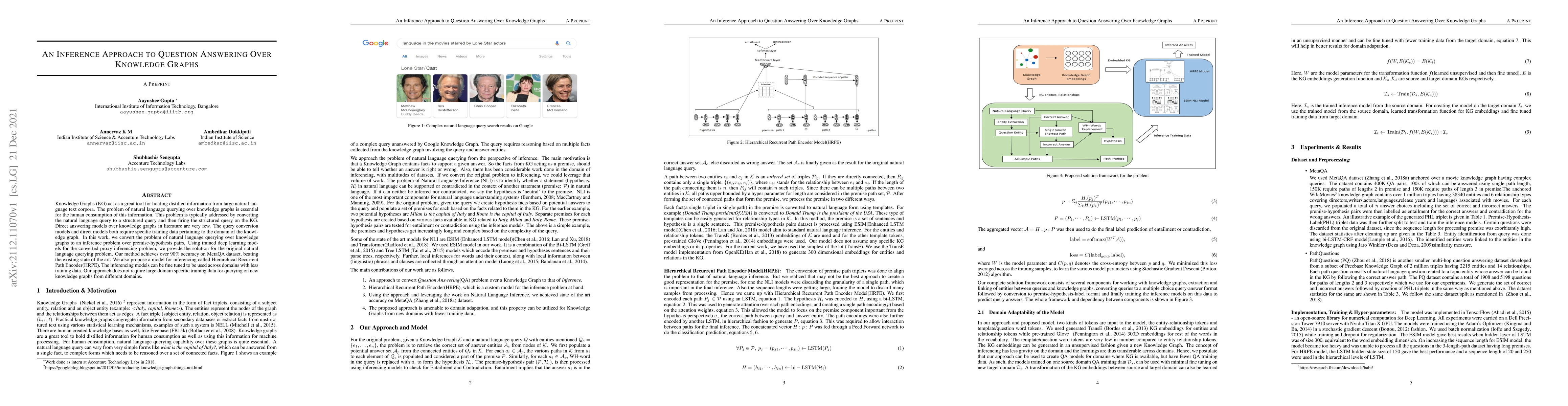 This paper presents an inference-based approach to natural language question answering over knowledge graphs, converting queries into premise-hypothesis pairs. The proposed Hierarchical Recurrent Path Encoder (HRPE) model achieves over 90% accuracy on the MetaQA dataset and requires less domain-specific training data, allowing for easier cross-domain usage.