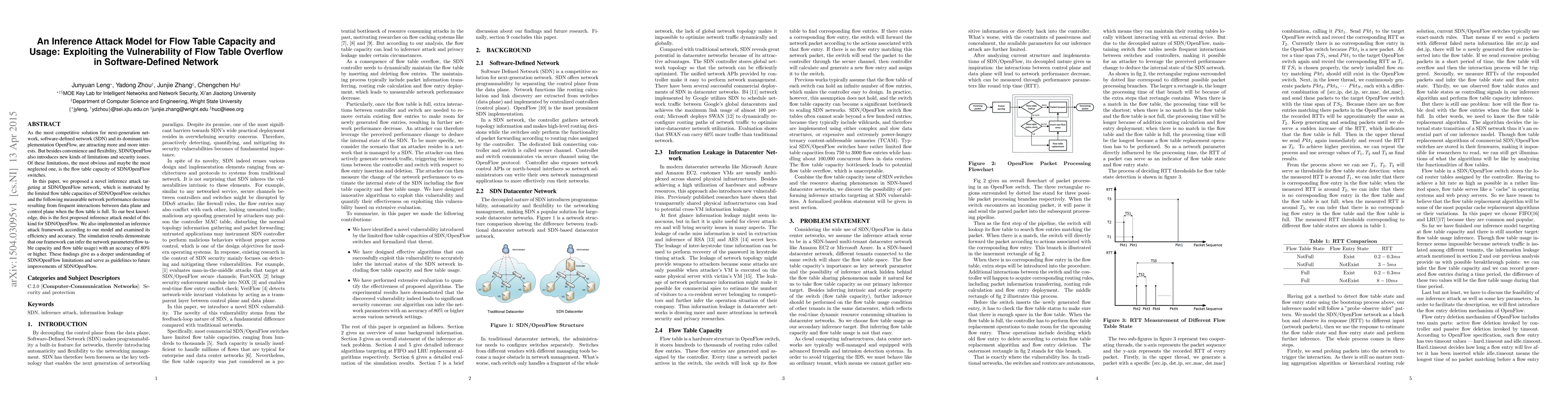 Researchers proposed an inference attack model to exploit SDN/OpenFlow network limitations, specifically flow table capacity and usage, achieving 80% accuracy in inferring network parameters.
