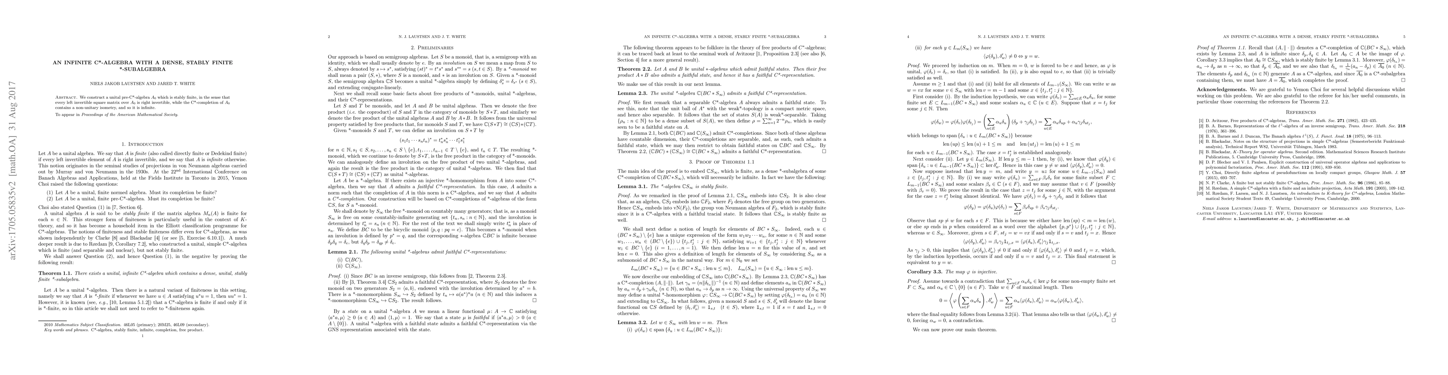 We construct a unital pre-C*-algebra $A_0$ which is stably finite, in the sense that every left invertible square matrix over $A_0$ is right invertible, while the C*-completion of $A_0$ contains a non-unitary isometry, and so it is infinite.