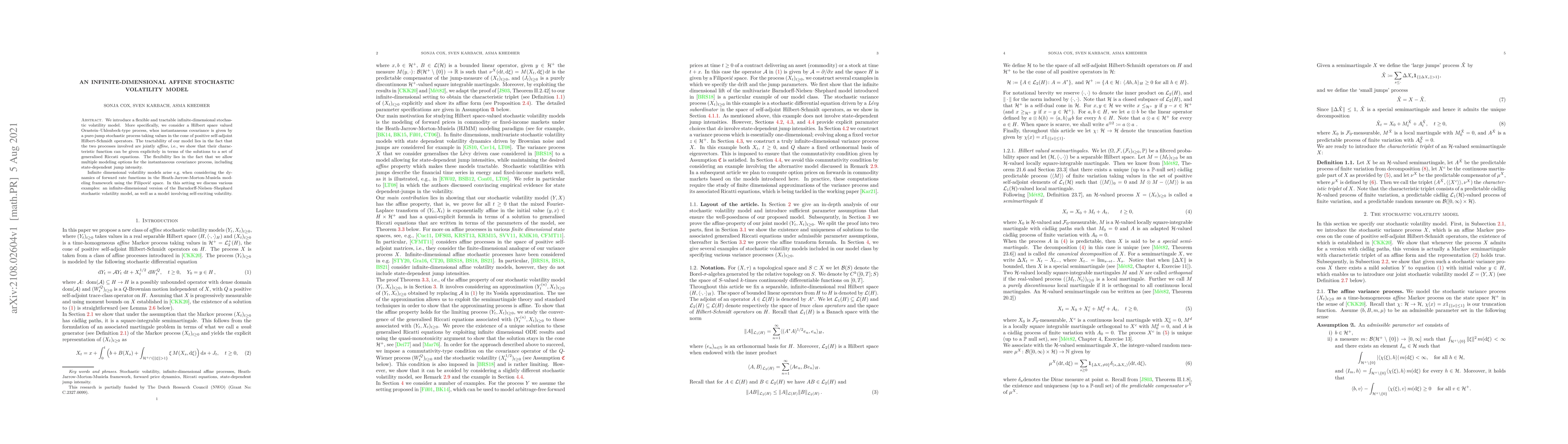 This paper proposes an infinite-dimensional affine stochastic volatility model using a Hilbert space valued Ornstein-Uhlenbeck process, with a pure-jump covariance process. The model's tractability is achieved through joint affine properties and explicit characteristic functions derived from generalized Riccati equations.