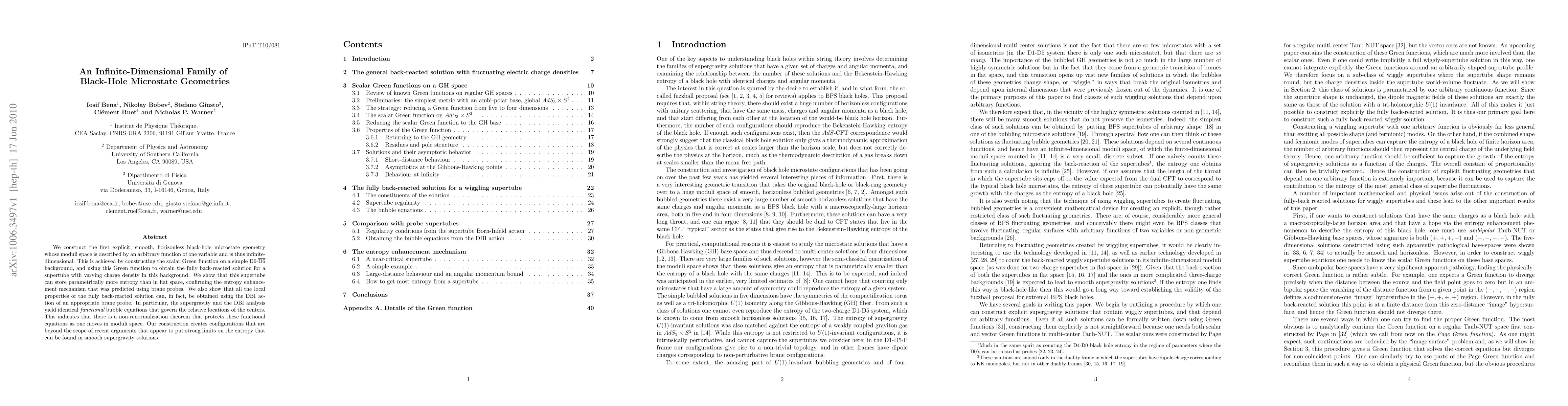 We construct the first explicit, smooth, horizonless black-hole microstate geometry whose moduli space is described by an arbitrary function of one variable and is thus infinite-dimensional. This is achieved by constructing the scalar Green function on a simple D6 anti-D6 background, and using this Green function to obtain the fully back-reacted solution for a supertube with varying charge density in this background. We show that this supertube can store parametrically more entropy than in flat space, confirming the entropy enhancement mechanism that was predicted using brane probes. We also show that all the local properties of the fully back-reacted solution can, in fact, be obtained using the DBI action of an appropriate brane probe. In particular, the supergravity and the DBI analysis yield identical functional bubble equations that govern the relative locations of the centers. This indicates that there is a non-renormalization theorem that protects these functional equations as one moves in moduli space. Our construction creates configurations that are beyond the scope of recent arguments that appear to put strong limits on the entropy that can be found in smooth supergravity solutions.