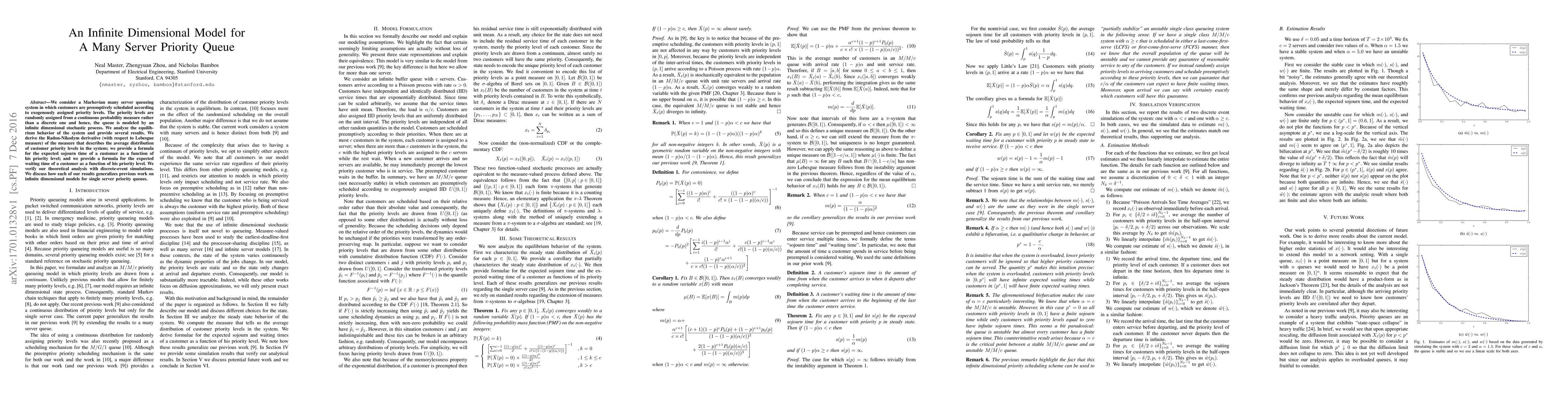 We consider a Markovian many server queueing system in which customers are preemptively scheduled according to exogenously assigned priority levels. The priority levels are randomly assigned from a continuous probability measure rather than a discrete one and hence, the queue is modeled by an infinite dimensional stochastic process. We analyze the equilibrium behavior of the system and provide several results. We derive the Radon-Nikodym derivative (with respect to Lebesgue measure) of the measure that describes the average distribution of customer priority levels in the system; we provide a formula for the expected sojourn time of a customer as a function of his priority level; and we provide a formula for the expected waiting time of a customer as a function of his priority level. We verify our theoretical analysis with discrete-event simulations. We discuss how each of our results generalizes previous work on infinite dimensional models for single server priority queues.