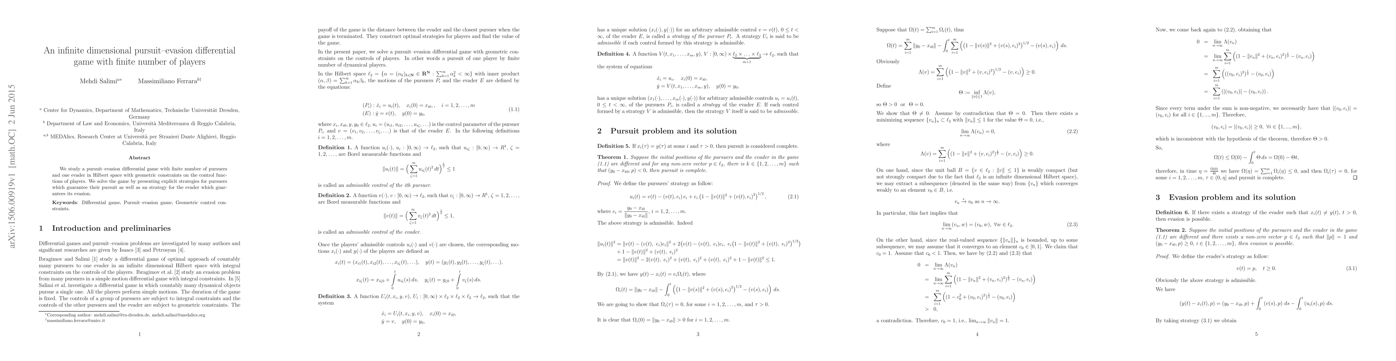 Summary: This paper investigates a pursuit-evasion game in an infinite-dimensional Hilbert space with finite pursuers and one evader, imposing geometric constraints on control functions. It provides explicit strategies ensuring successful pursuit by the pursuers and evasion by the evader.